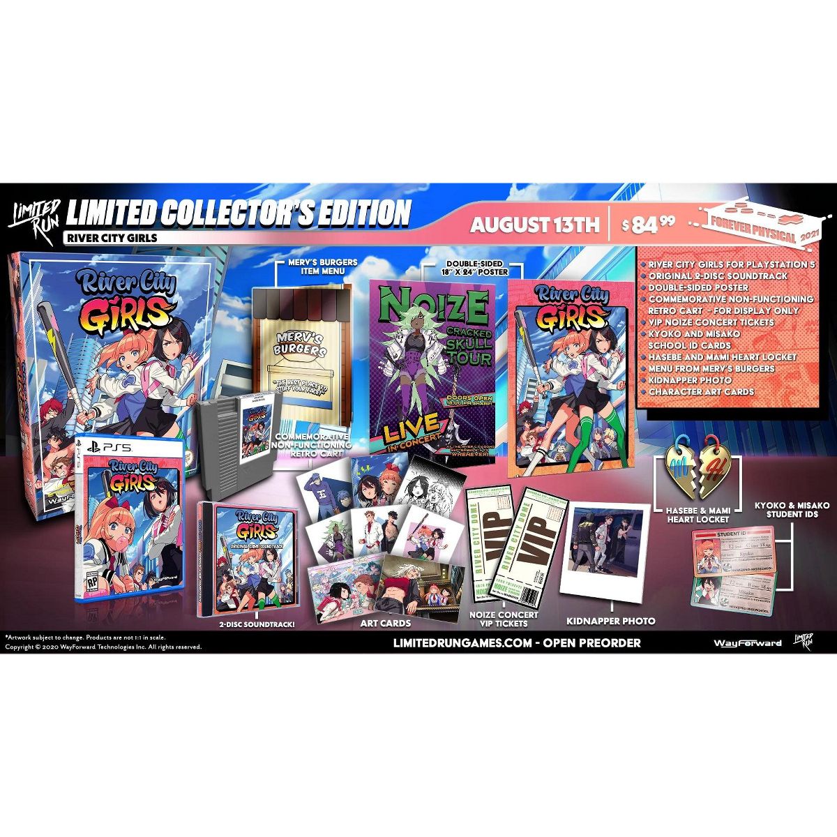 There's trouble once again on the mean streets of River City, but this time the boys are in over their heads in River City Girls - Collector's Edition from WayForward and Limited Run Games for the Sony PS5!The River City Girls Collector's Edition includes River City Girls Limited Run #10 for PS5, Original 2- Disc Soundtrack, 18" x 24" Double-Sided Poster, Commemorative Non-functioning retro cart - for display only, VIP Noize Concert Tickets, Kyoko and Misako Student IDs, Hasebe and Mami Heart Locket, Menu from Merv's Burgers, Kidnapper Photo and 8 Character Art Cards!In this all-new entry in the legendary beat-'em-up series, hot-blooded heroes Kunio and Riki have been captured, leaving it to their hard-hitting girlfriends, Kyoko and Misako, to serve up some payback.As you punch and kick your way across town - either solo or with a friend in local co-op - you'll gain new skills, chow down on power-ups, wield an assortment of weapons, and unleash an arsenal of combos, throws, and special attacks that will leave the bad guys crying for mama - all in outrageous 16-bit style! The awesome action is punctuated by manga story panels, anime cutscenes, and an epic synth-pop soundtrack. It’s an old-school rumble for a new generation!Features:Wild beat-'em-up action for 1 or 2 players.Glorious anime and manga cutscenes.Rockin’ synth-pop soundtrack.Six large areas of the city to explore and fight in.Loads of weapons, items, and abilities.River City Girls is on a region-free physical disc for the PlayStation 5.