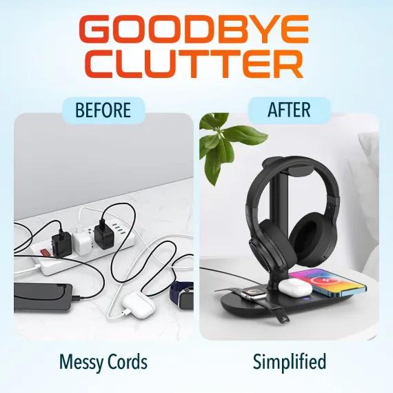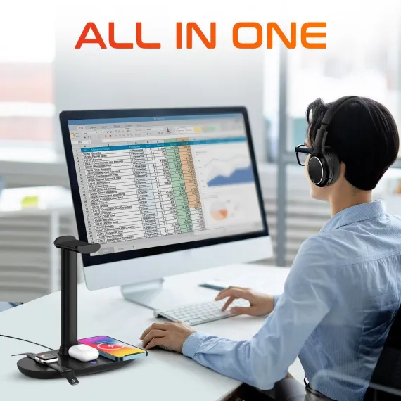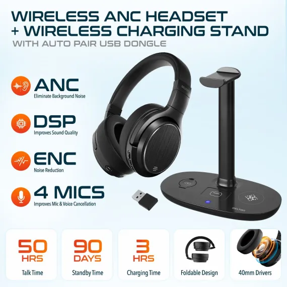 Delton M101 Wireless Noise Canceling Bluetooth Stereo Computer Headset and HS1 Stand/Desktop Organizing Wireless Charger, Black