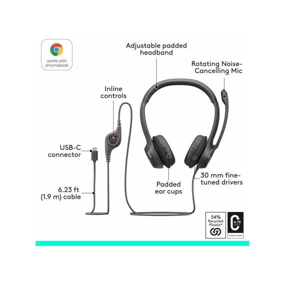 Experience clear audio for video meetings with a simple plug-and-play USB-C connection and a noise-canceling mic. Rigid left-sided mic boom is moveable and can be tucked out of the way when not in use. Handy inline controls let you adjust volume or mute without interrupting calls. Fine-tuned drivers deliver enhanced digital audio for meetings, music, and more.H390 is built with plastic components that include a minimum of 54% post-consumer recycled plastic(1). The packaging includes paper from FSC-certified forests to support responsible forest management. The carbon footprint of this product is 4.78 kg CO2e.