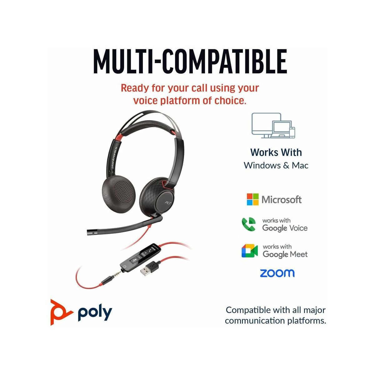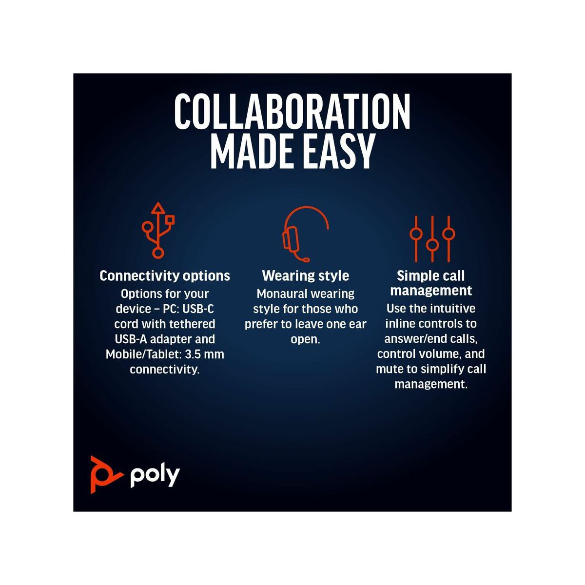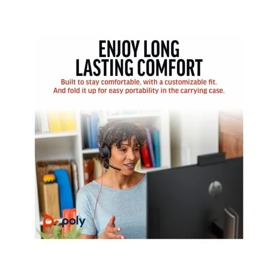 Wear it wellThe Blackwire 5200 Series fits your busy workday. Ergonomically designed for long lasting comfort. And with the easy-to-use connectivity you can work on a variety of devices throughout the day.Get great soundTune out the inevitable workplace distractions with a headset full of features - soft, conforming ear cushions that provide passive noise canceling and a precisely tuned microphone masks nearby conversations.Enjoy long lasting comfortYour ears will thank you, especially after long conference calls. This headset is built to stay comfortable. Adjust it to fit the way you work. Need to move locations? The headset folds up for easy portability in the carrying case.Features | Connectivity options Enhanced connectivity for your devices: USB-C cord with tethered USB-A adapter for PC and 3.5 mm for mobile or tablet connectivity.Comfort and durability Ultra-soft leatherette ear cushion(s) wrapped around pillow-soft memory foam provide long lasting comfort. A lightweight cushioned metal headband offers durability and a comfortable custom fit.Wearing style Hi-fi stereo wearing style for those who want a richer, more immersive experience.Simple call management Use the intuitive inline controls to answer/end calls, control volume, and mute to simplify call management. Conveniently placed indicator lights provide helpful but unobtrusive user call, mute, and volume status.Outstanding audio quality Premium PC wideband audio with noise-canceling microphone and Digital Signal Processing (DSP) for a more natural voice sound.Enhanced call quality Dynamic EQ optimizes the quality of your voice on calls, and automatically adjusts the EQ settings when you want high-quality sound for listening to music or for multimedia playback.
