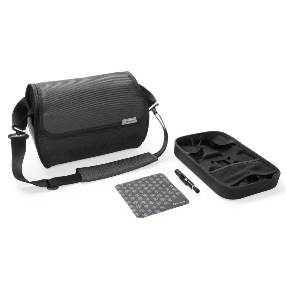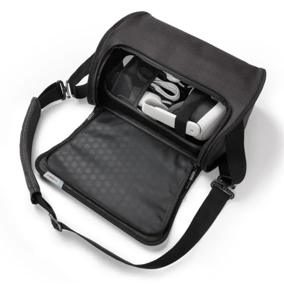Take your Meta Quest 3 / 3S with you safely and stylishly with the PowerA Travel Bag for Meta Quest 3 / 3S. This officially licensed travel bag features a molded storage tray and elastic straps to securely hold your headset and controllers in place. The zippered closure helps protect your gear from dust and dirt, and the removable adjustable shoulder strap allows it to be worn crossbody or on the shoulder. A padded back-panel pocket holds earbuds or other small accessories. Includes a microfiber cleaning cloth and brush pen to keep your headset clean. 2-Year Limited Warranty.