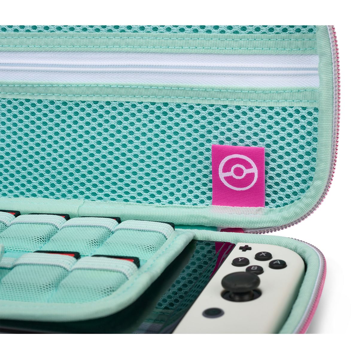 Take your Nintendo Switch - OLED Model, Nintendo Switch or Nintendo Switch Lite on the go with this sturdy compact case designed to fit the console in handheld mode. Inside you’ll find a felt lining, screen-protector flap with storage for nine game cards, logo tag and zippered mesh storage pocket. This portable case gives you the freedom to have fun on the go with your Nintendo Switch. Wherever. Whenever.