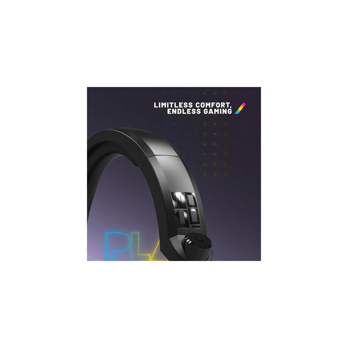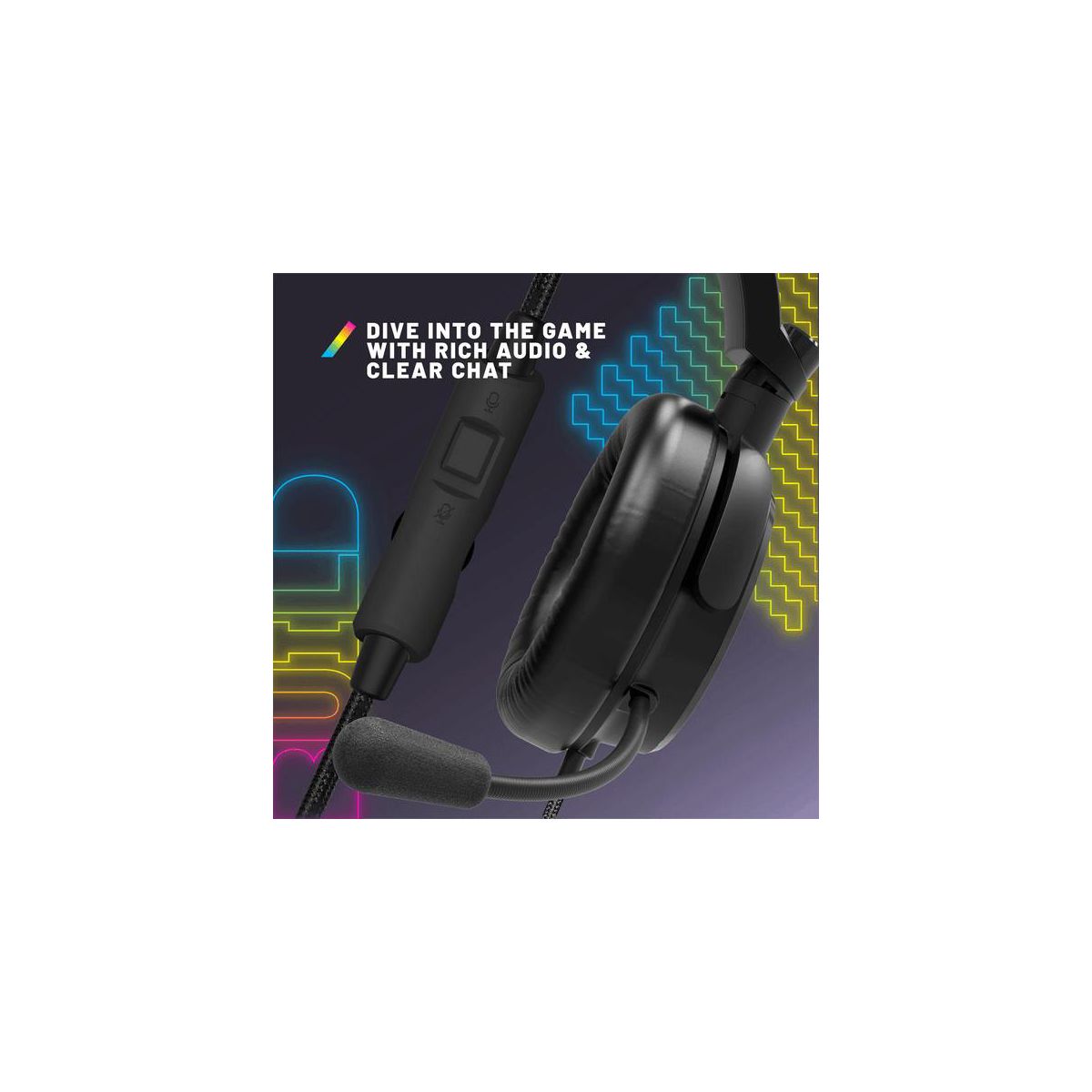 A Light-Up Gaming Headset, compatible with PS4, PS5, Xbox One, Series S, Series X, Nintendo Switch, PC and mobile devices.Light up your gameplay with rechargeable, animated lighting effects with included cable.Designed for comfort and portability, it features soft-foam leatherette ear cushions for extended gameplay and fold-flat earcups for easy storage or travel. The adjustable headband ensures a secure and comfortable fit for players of all ages. Enjoy quality audio with 40mm speakers that bring your games to life, while the flexible mic captures your voice clearly for smooth team chat. Also features in-line controls that make it easy to adjust game and chat volume without interrupting gameplay.The durable braided cable resists tangling and daily wear, while the plug-and-play setup makes getting started quick and effortless.
