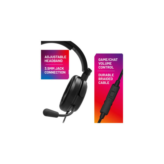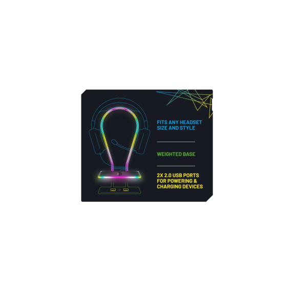 The LED Light-Up Gaming Headset and Light-up Headset Stand, both compatible with PS4, PS5, Xbox One, Series S, Series X, Nintendo Switch, Switch 2, PC and mobile devices.Features C6-100 Headset with soft-foam, fold-flat leatherette ear cushions, a flexible microphone, an adjustable headband, and a durable braided cable for long-lasting comfort and reliability.Get lost in the action with quality audio and clear chat with the headphone's mic and speakers. Plus, adjusting game audio and chat volume is easy with the in-line controls.Also includes Light-Up Headset Stand to display your Gaming Headset neatly in one place, plus a weighted base for enhanced stability.USB powered with 2 USB ports for charging and powering your other devices.