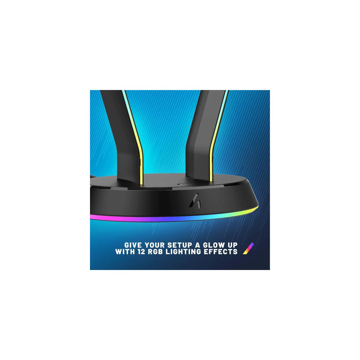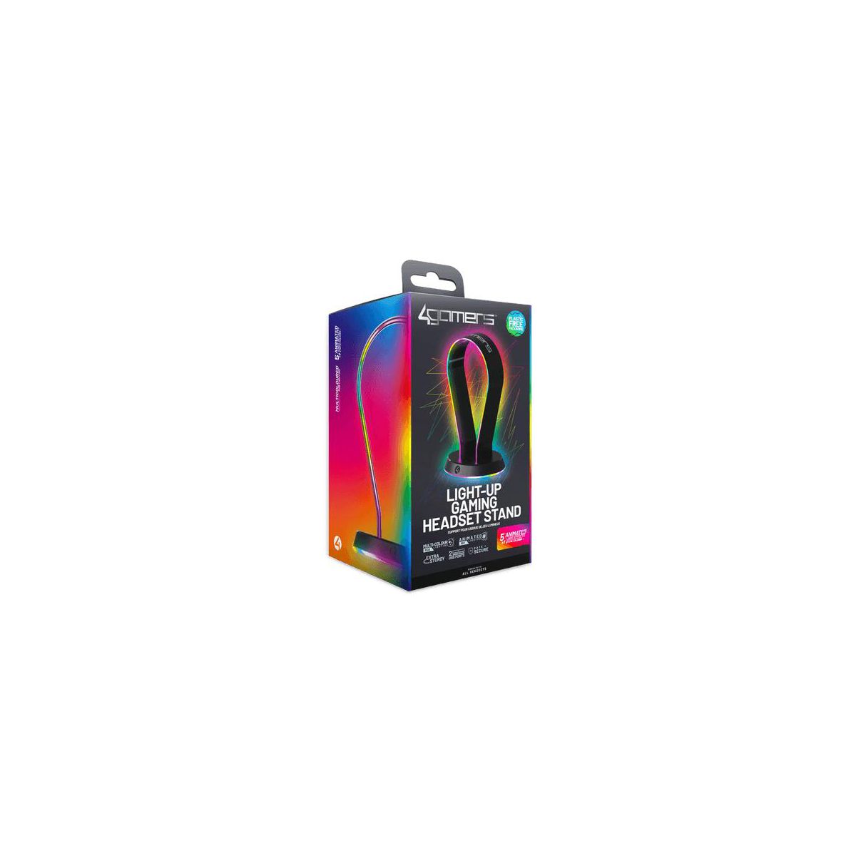 A Light-Up Headset Stand to display your headset neatly and safely. Compatible with all headsets for PS4, PS5, XBOX One, Series S, Series X, Nintendo Switch, Switch 2, PC and mobile devices.USB powered with 2 USB ports for charging and powering your other devices.Give your setup a glow up with full RGB lighting, featuring 12 different colour modes.Designed with a weighted base for stability. Pairs perfectly with our other 4Gamers LED Light Up Gaming Accessories.
