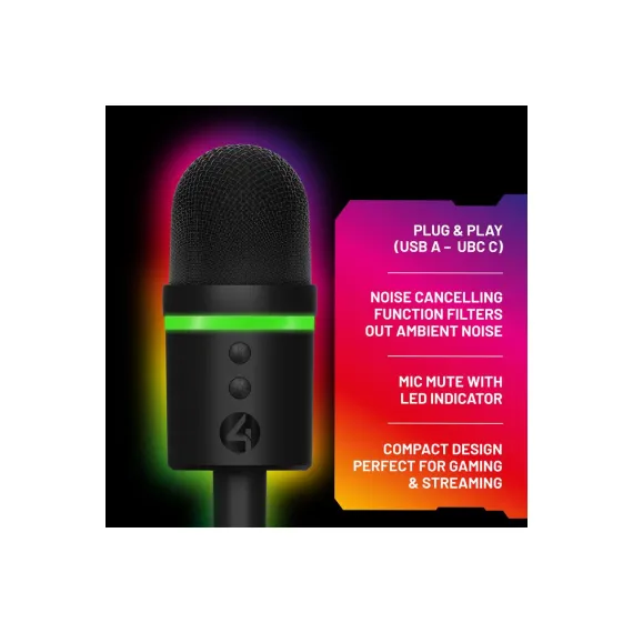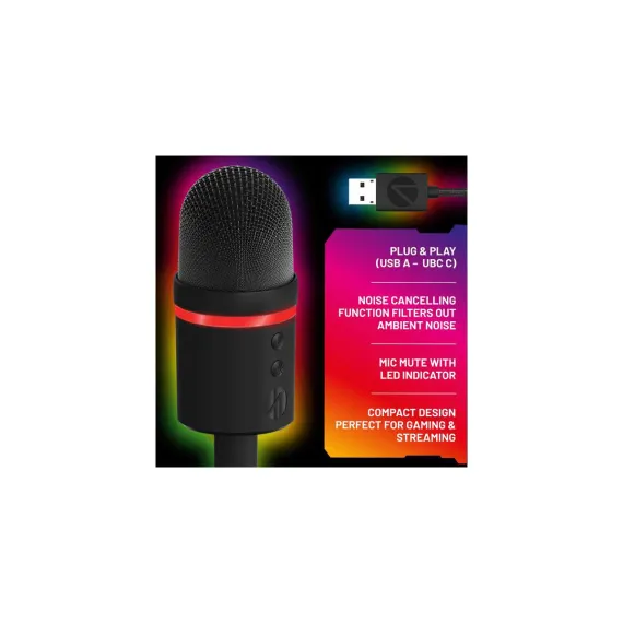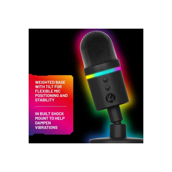 Light Up Streaming Microphone compatible with PC, PS4 and PS5 with supercardioid pick-up pattern and noise-cancelling function to reduce background noise. With its compact design, this small but mighty mic features a weighted base with 360 tilt, plus a built-in shock mount for clear streaming and uninterrupted recording.Muting your mic and controlling the 12 RGB lighting effects is at the touch of a button.Powered by USB for an effortless setup, simply plug in, and you're ready to go.