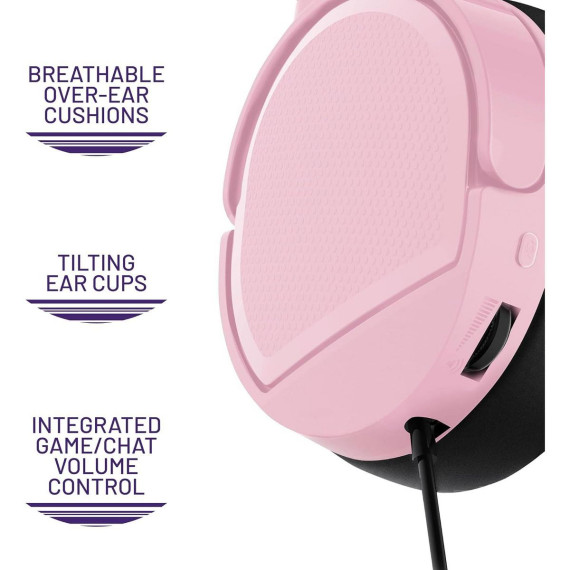 A multi-platform gaming headset, compatible with PS4, PS5, Xbox One, Series S, Series X, Nintendo Switch, Switch 2, PC and mobile devices.Lightweight, comfortable design with soft-foam, breathable mesh ear cushions and adjustable, padded headband. The speakers airflow chambers and pinpoint mic offer rich audio and clear chat while the integrated controls make adjusting game audio and chat easy.Set up is effortless with the 3.5mm jack connection.Matte finish in pastel pink with gloss accents.