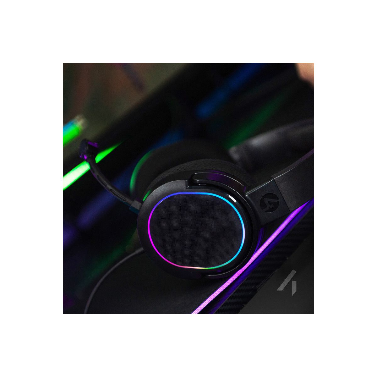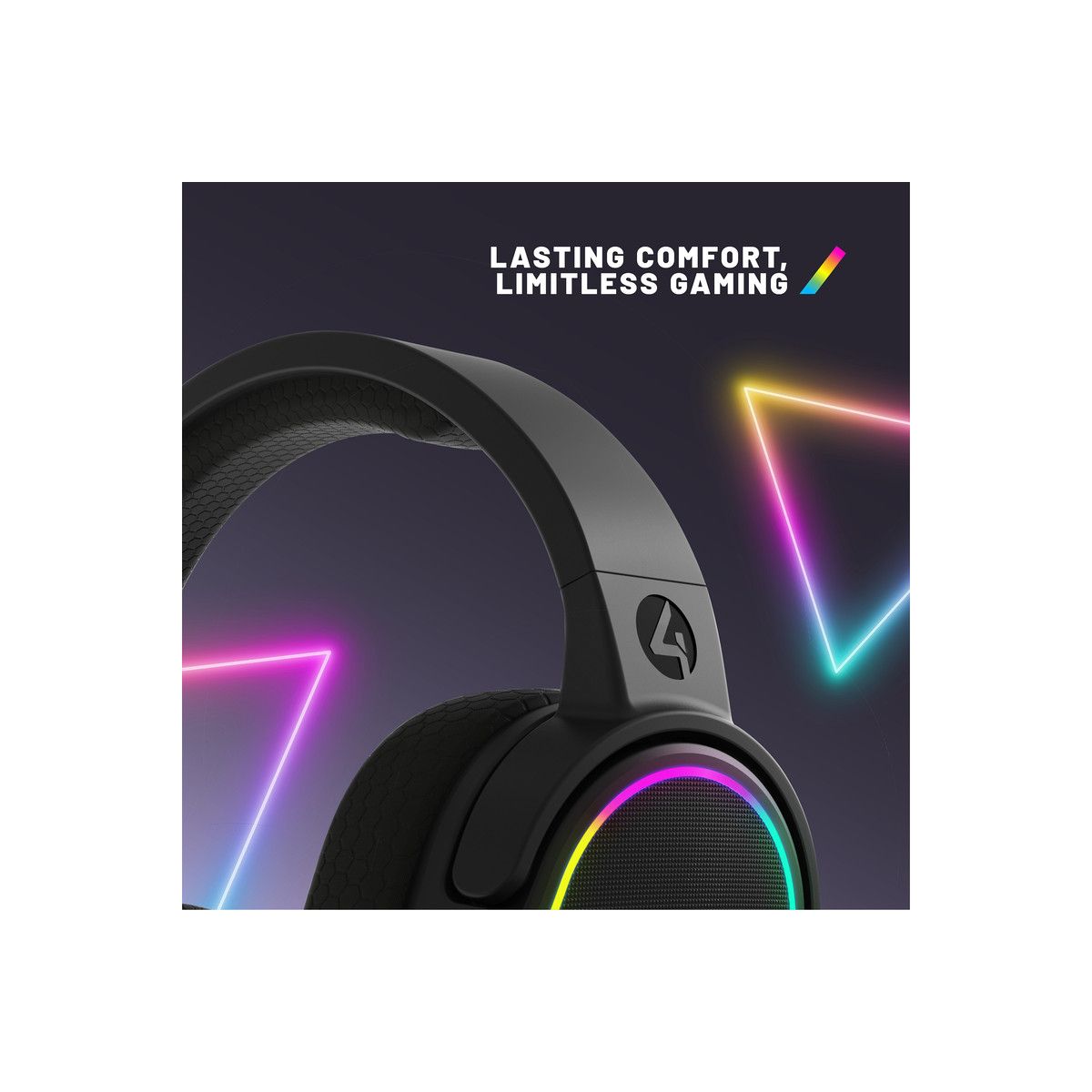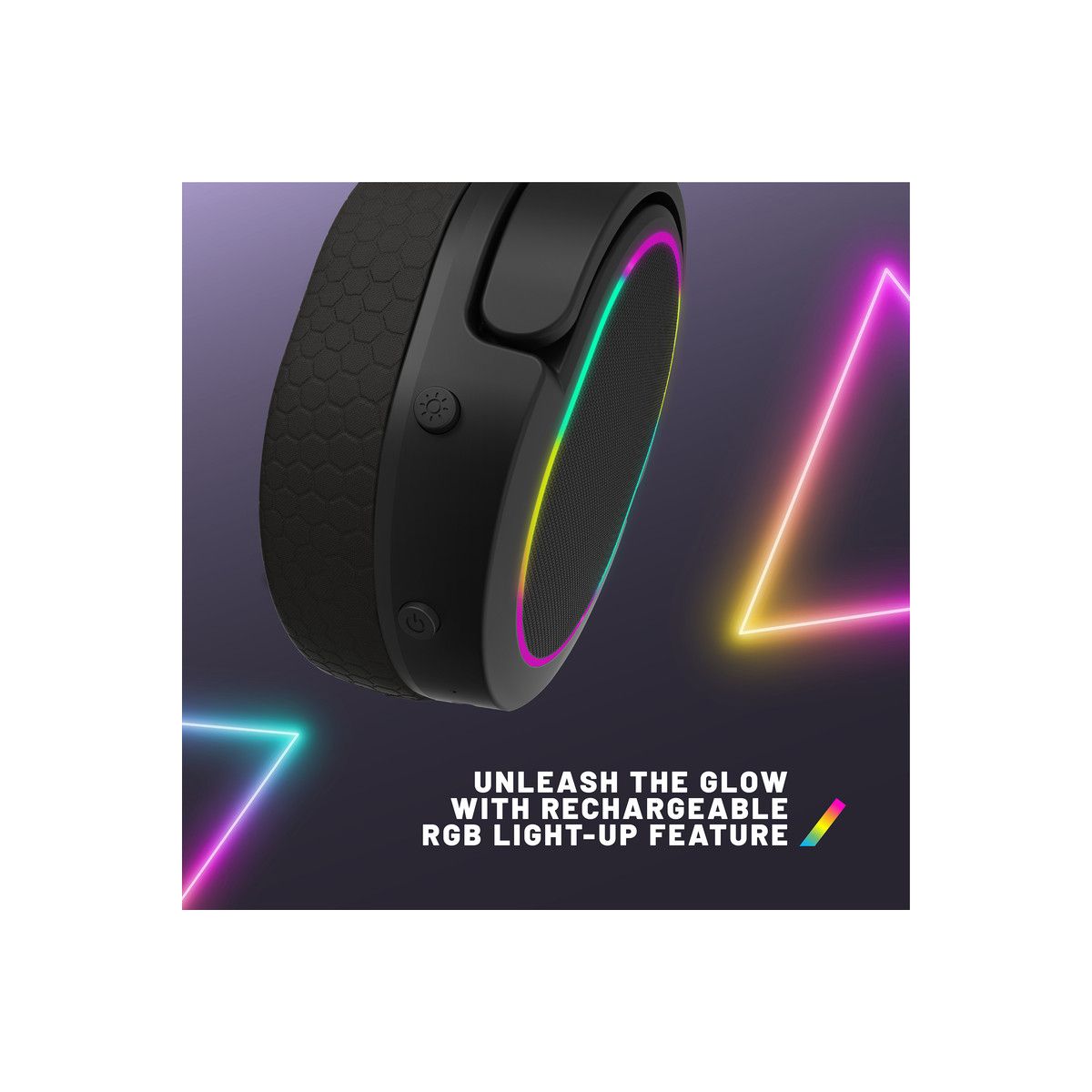Light Up Gaming Headset, compatible with PS4, PS5, Xbox One, Series X/S, Nintendo Switch, PC & mobile devices.Features animated lighting effects with off mode that you can recharge with the included USB-C cable.Designed for comfort with breathable, soft-foam ear cushions & an adjustable padded headband. Built with premium speakers with airflow chambers and a flexible mic for clear audio & chat, perfect for immersive gameplay.Easily control volume with integrated controls & mic mute function.Features a matte-black finish with glossy accents.