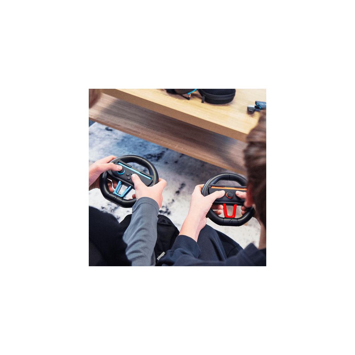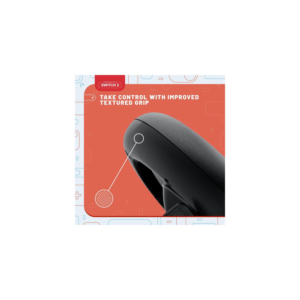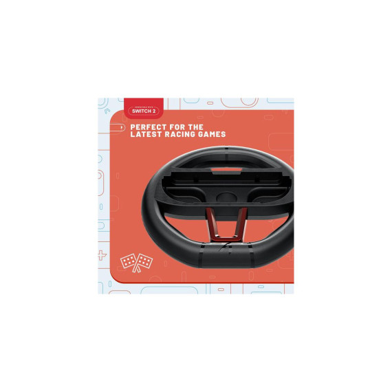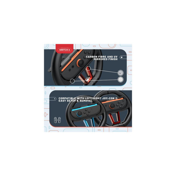 Twin racing wheels compatible with Joy-Con 2 controllers to make the latest racing games even more exciting.Stay on track with the wheel's larger shoulder buttons, which are easy to reach, offering more comfort and reducing strain.Features improved textured grip for enhanced control, so you can take first place with ease.Enjoy effortless set-up, simply install your controllers into the Racing Wheel, and you're ready to race.Carbon fibre and UV-mirrored finish.
