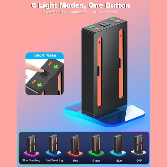 With a dual-color LED indicator, the dock displays an ORANGE light during charging and switches to GREEN when fully charged or empty, making it easy to track battery status at a glance. Customizable 6 LIGHTING EFFECTS (Slow/Fast Breathe, Red/Green/Blue, or Total Light Off) allow you to set the perfect ambiance for gaming or living spaces.