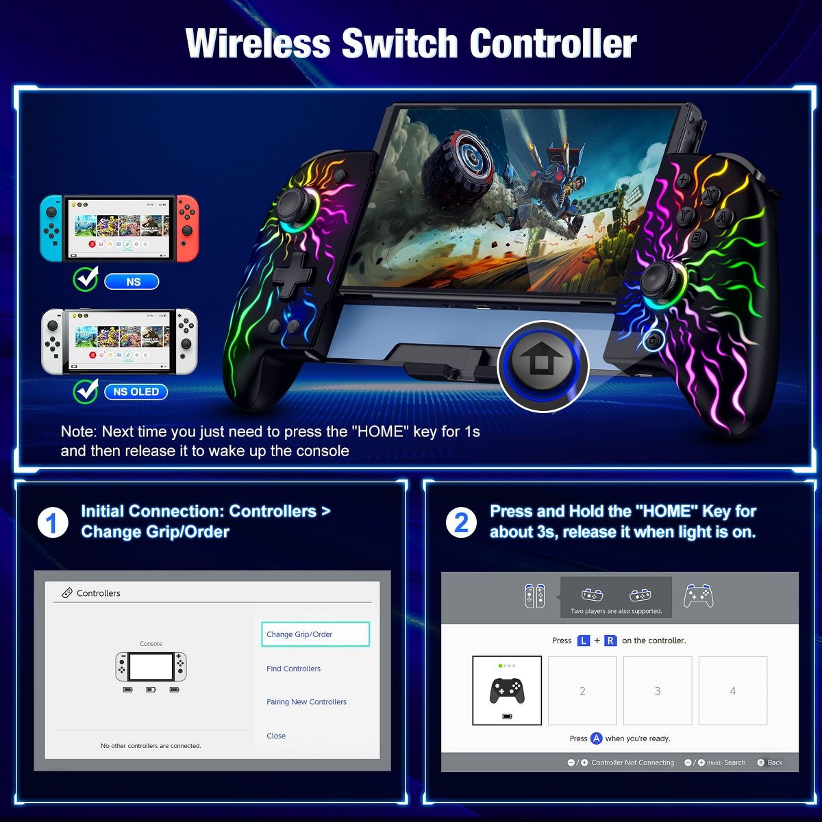 Experience the ultimate gaming control with our dedicated Switch Controller. Designed specifically for the Nintendo Switch and Switch OLED host, this pro controller enhances your gaming experience in every way. Feel the action come to life with the dual motor vibration, immersing you deeper into the game. With the somatosensory function, enjoy precise motion control that adds a new level of interactivity. Take your gameplay to the next level with the burst function, offering both manual and automatic bursts with adjustable speed settings. With 17 dazzling light-emitting effects and adjustable brightness, the illuminated dual joysticks create a visually stunning gaming environment. And with a comfortable and large grip, enjoy extended handheld play without sacrificing comfort. Elevate your gaming experience with our Switch Controller and unlock your full gaming potential.(No NFC)