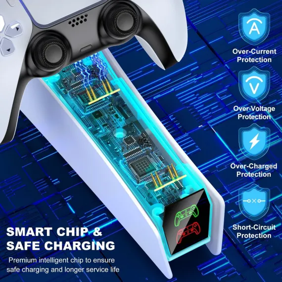 Upgrade your PS5 gaming setup with the BEBONCOOL Dual Controller Charging Dock! Charge PS5 controllers (including PS5 Elite) simultaneously in just 2.5-3 hours using the included 80cm Type-C cable. Features vibrant RGB lighting with 3 customizable modes (Fast Flashing, Breathing, Steady Blue) and a sleek projection light for immersive gaming vibes. Built-in safety tech protects against overcharging, while the compact design keeps controllers organized. Perfect for gamers needing fast, stylish, and clutter-free charging!