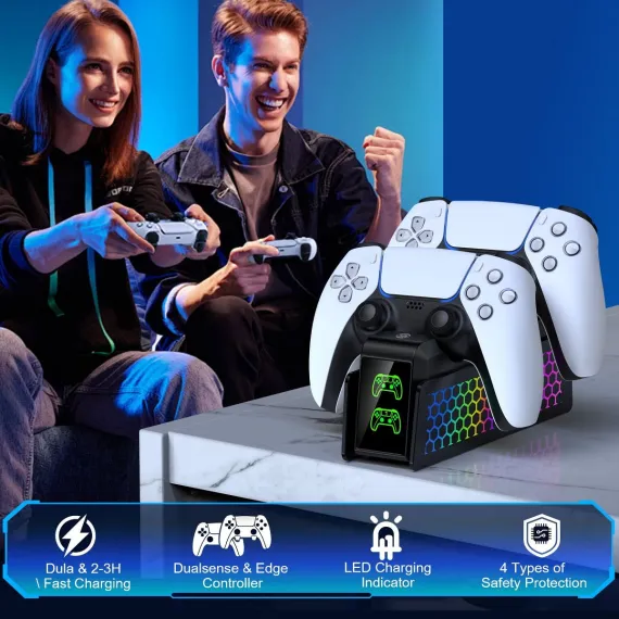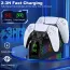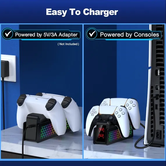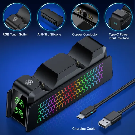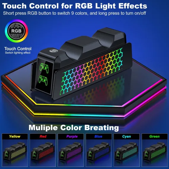 Upgrade Your PS5 Gaming Experience with this All-in-One Controller Charger! Dual Fast Charging for PS5 & Elite controllers—charge 2 devices simultaneously in 3 hours (0-100%), with consistent speed via optimized USB-C technology. Monitor charging status instantly via triple-LED indicators (Red: Charging, Green: Full/Standby), ensuring efficient power management. Enhance your setup with 9 Customizable LED Lights Modes, controlled by simple touch: tap to cycle effects or hold to disable side LEDs, syncing seamlessly with your gaming vibe. Safety-first design includes built-in protections against over-voltage, short-circuit, and overheating. Store controllers neatly in a compact design that saves desk space, while powering via PS5 USB or 5V/3A adapter (USB-C cable included). Perfect for gamers seeking a tidy gaming station with reliable charging security and dynamic ambiance lights.