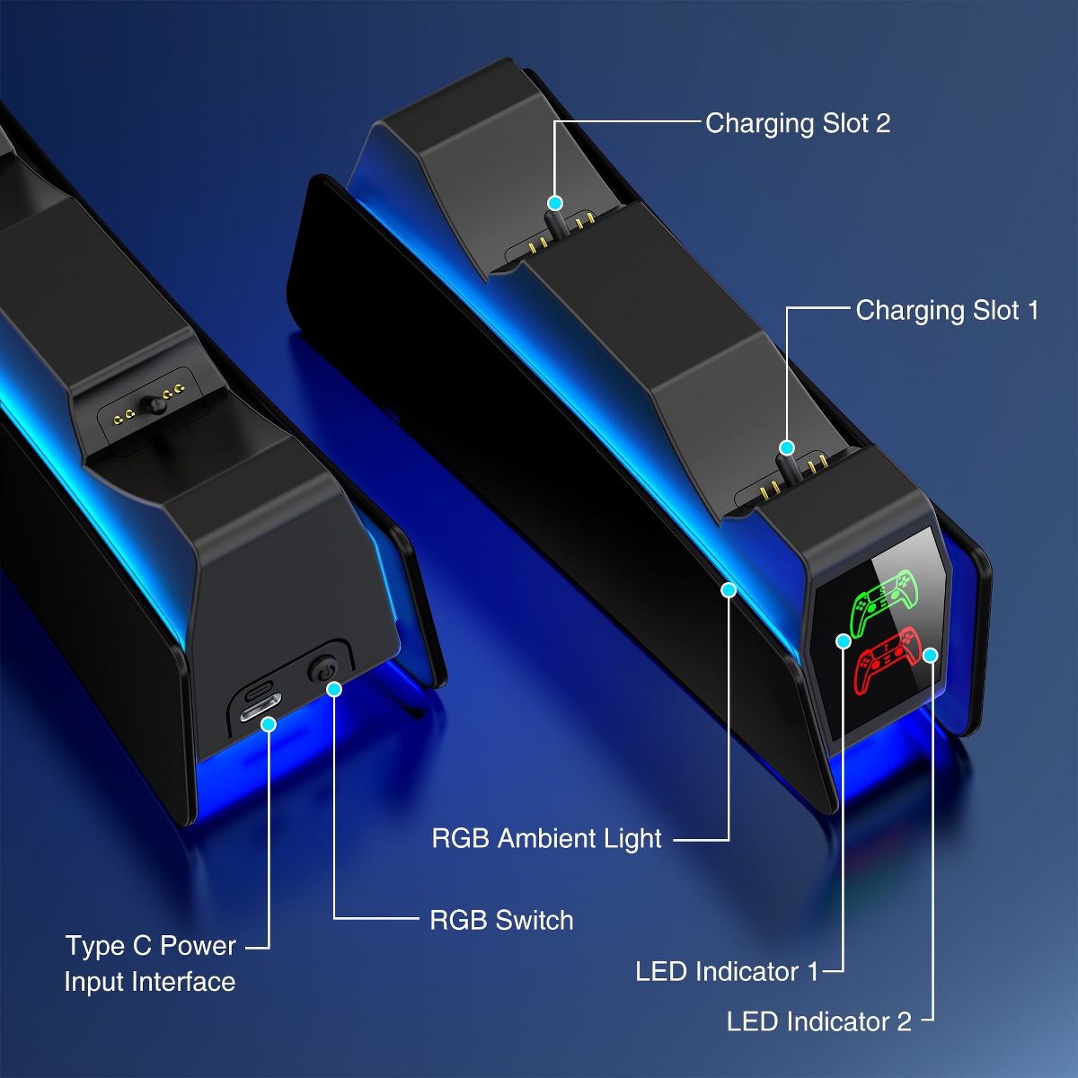 Upgrade your PS5 gaming setup with the BEBONCOOL Dual Controller Charging Dock! Charge two PS5 controllers (including PS5 Elite) simultaneously in just 2.5-3 hours using the included 80cm Type-C cable. Features vibrant lighting with 3 customizable modes (Fast Flashing, Breathing, Steady Blue) and a sleek projection light for immersive gaming vibes. Built-in safety tech protects against overcharging, while the compact design keeps controllers organized. Perfect for gamers needing fast, stylish, and clutter-free charging!