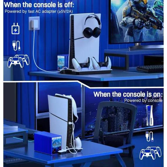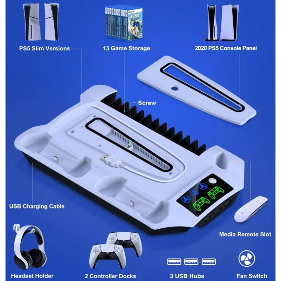 Hold ps5 headset, dual ps5 controller, ps5 media remote and ps5 system all in one playstation 5 stand. Keeps all PlayStation 5 accessories nice and organized while maintaining a tidy look.