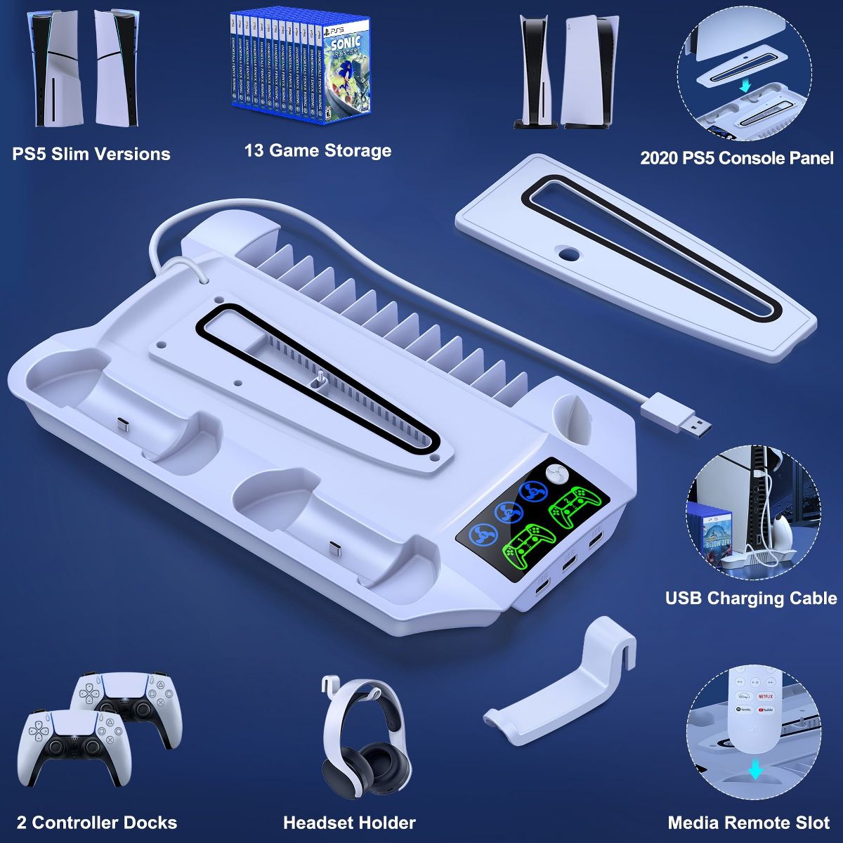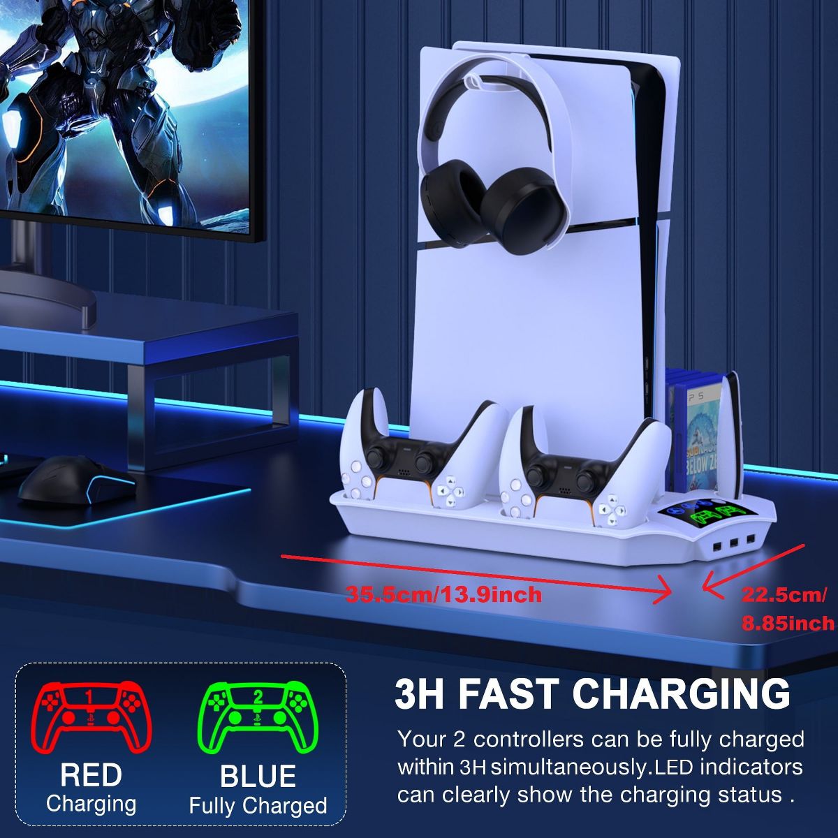 With a sleek and tidy design, PS5 remote charging station would be saves much space to keep your PS5 assecories like console, 2 Dualsense controllers, 13 game discs and headset organized,It will make the docking station more secure and balanced,compact size help to save space & increase gaming room’s space efficiency.Keeps all PlayStation 5 accessories nice and organized while maintaining a tidy look.