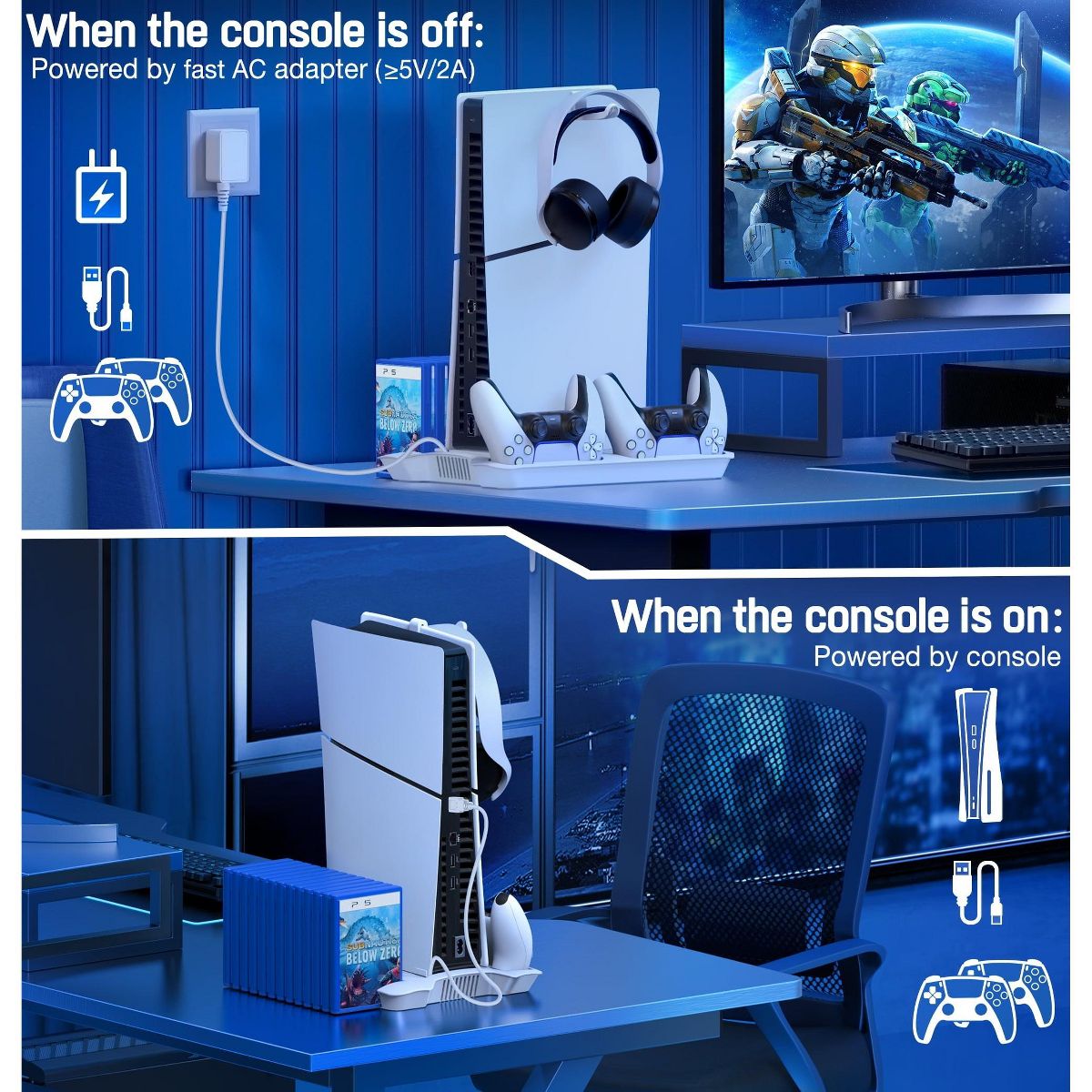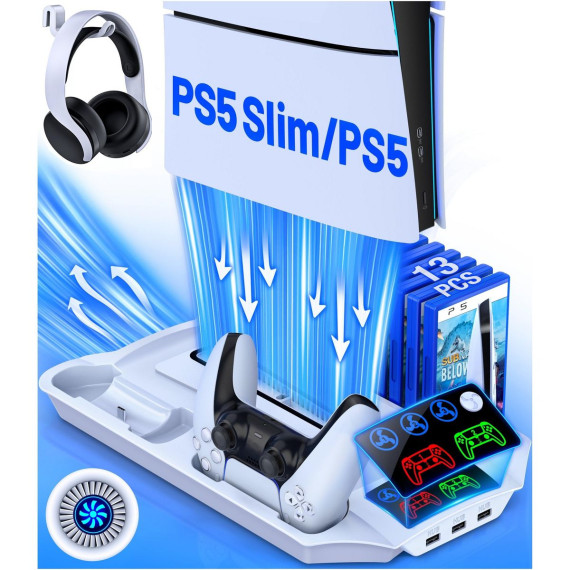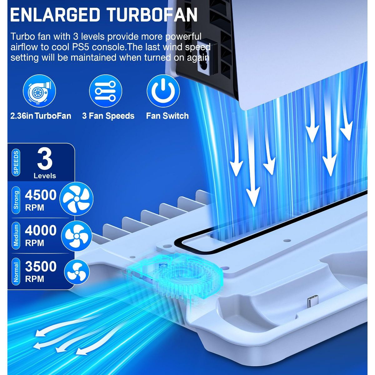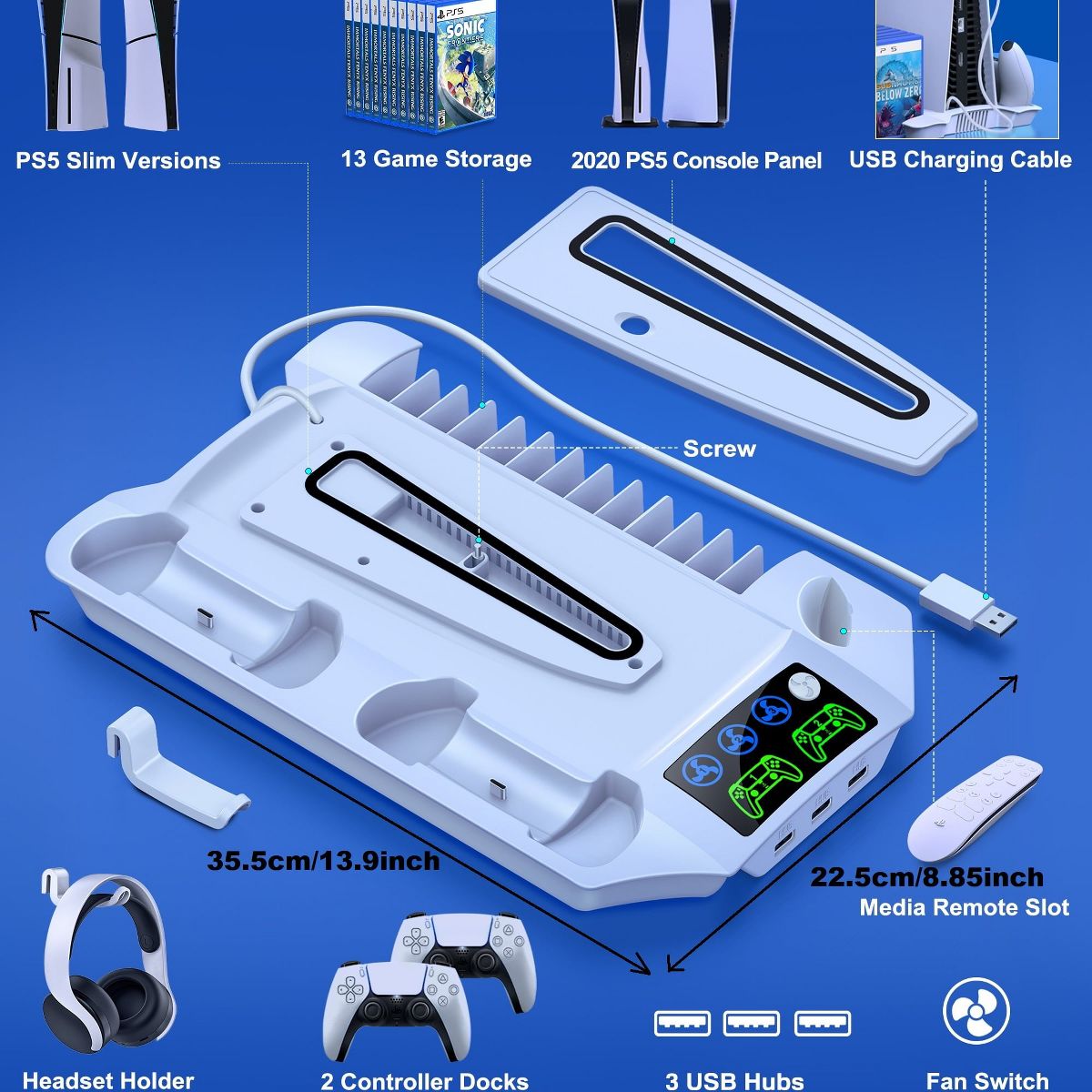 This beboncool PS5 cooling stand with efficient cooling fans and dual ps5 controller charger station,headset holder,3 extra USB charging ports, This ps5 cooling station can quickly charge two ps5 dual sense at the same time,The space-saving design allows you to display your console vertically and provides centralized storage space,Put controllers, the headphone and remote together,Also you can adjust the cooling fan speed between low, medium and high speeds.