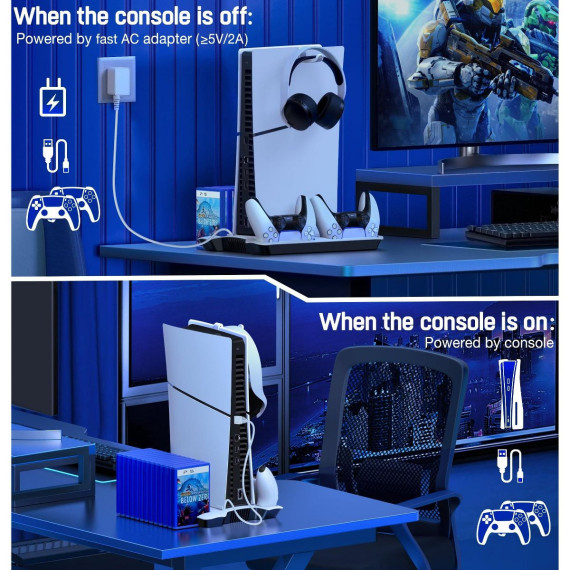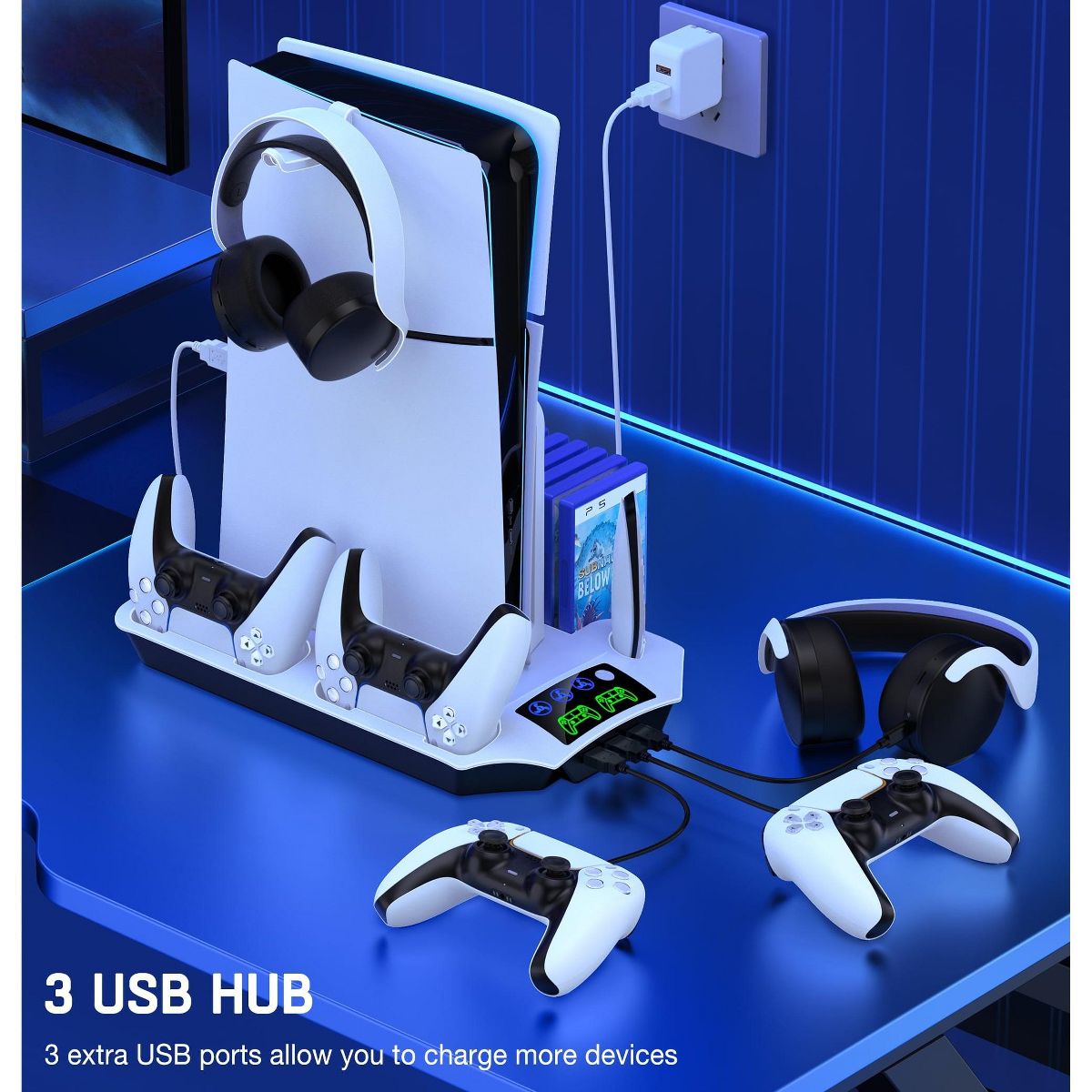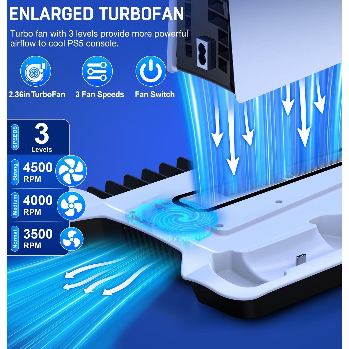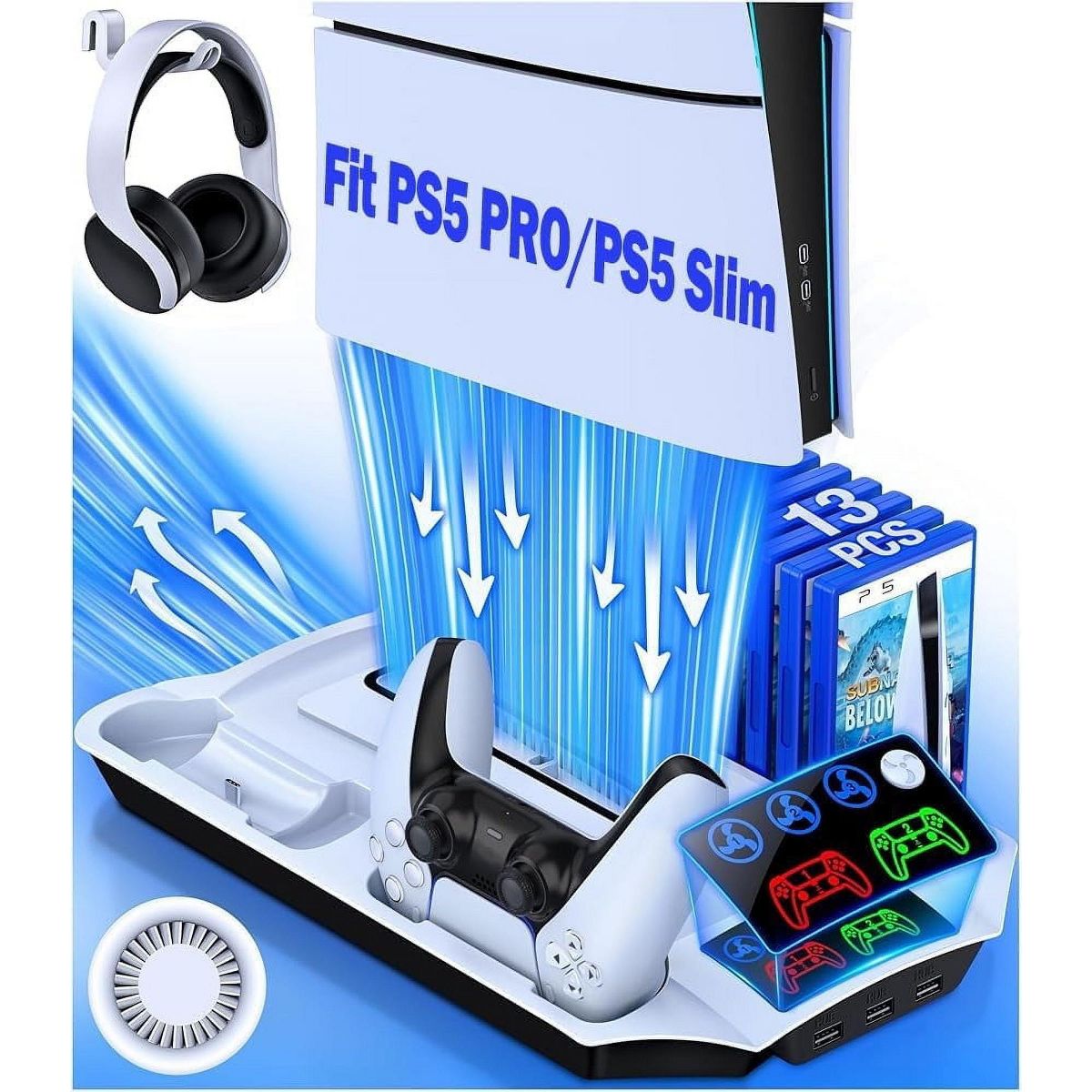 Enhance your PlayStation 5 gaming experience with the Beboncool PS5 Cooling Fan Stand and Dual Controller Charger Station. This versatile accessory keeps your console cool and prevents overheating, even during extended gaming sessions. Designed to accommodate both the PS5 Slim and the 2020 Playstation 5 Disc & Digital Edition Console, it provides a convenient and organized way to store your PS5 console, two Dualsense controllers, 13 game discs, and a headset. With its sleek and compact design, this accessory helps maintain a tidy gaming setup while ensuring the longevity of your valuable PS5 system.