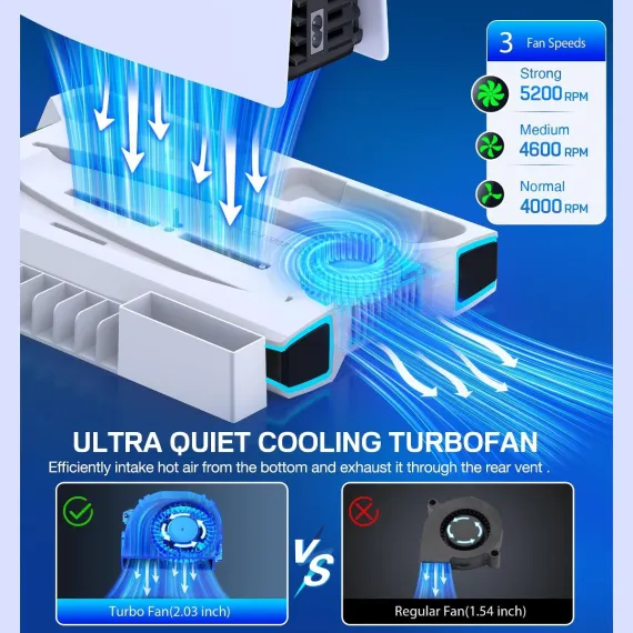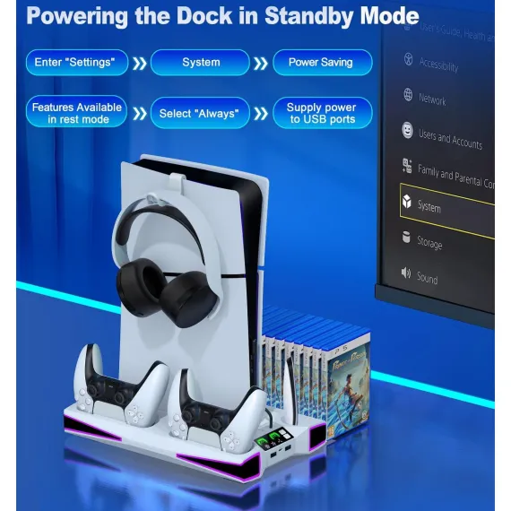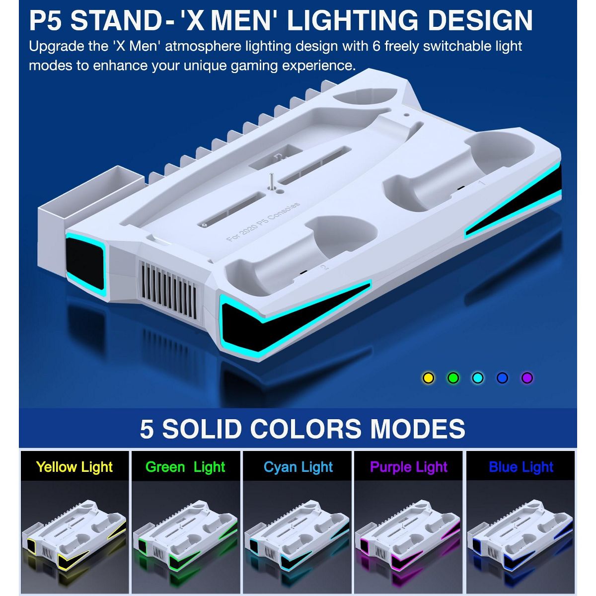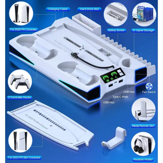 Introducing the Beboncool PS5 cooling station designed for seamless organization of your PS5 headset, dual PS5 controller, PS5 media remote, and PlayStation 5 system in one sleek unit. This versatile PS5 stand keeps all gaming gear tidy, eliminating clutter while maximizing airflow to cool your console efficiently. Compatible with 2020 PS5 Digital/Disc Edition and the 2023 PS5 Slim, it’s a PS5 gamer gift that ensures safe storage and stylish display. The ergonomic design features dedicated slots for accessories, ensuring quick access and protection against dust. Perfect for gamers seeking a neat organizer that combines functionality with aesthetics, this stand enhances your setup’s longevity and visual appeal. Whether you’re a PS5 enthusiast or shopping for a gift, this PS5 accessory storage solution offers unmatched convenience and space-saving efficiency.