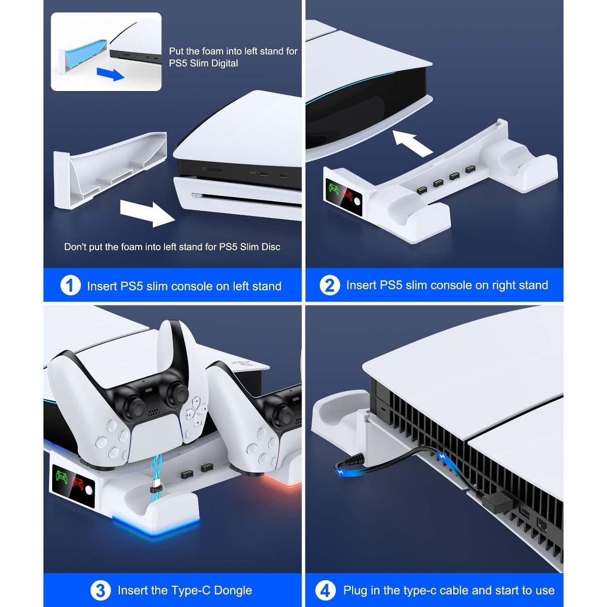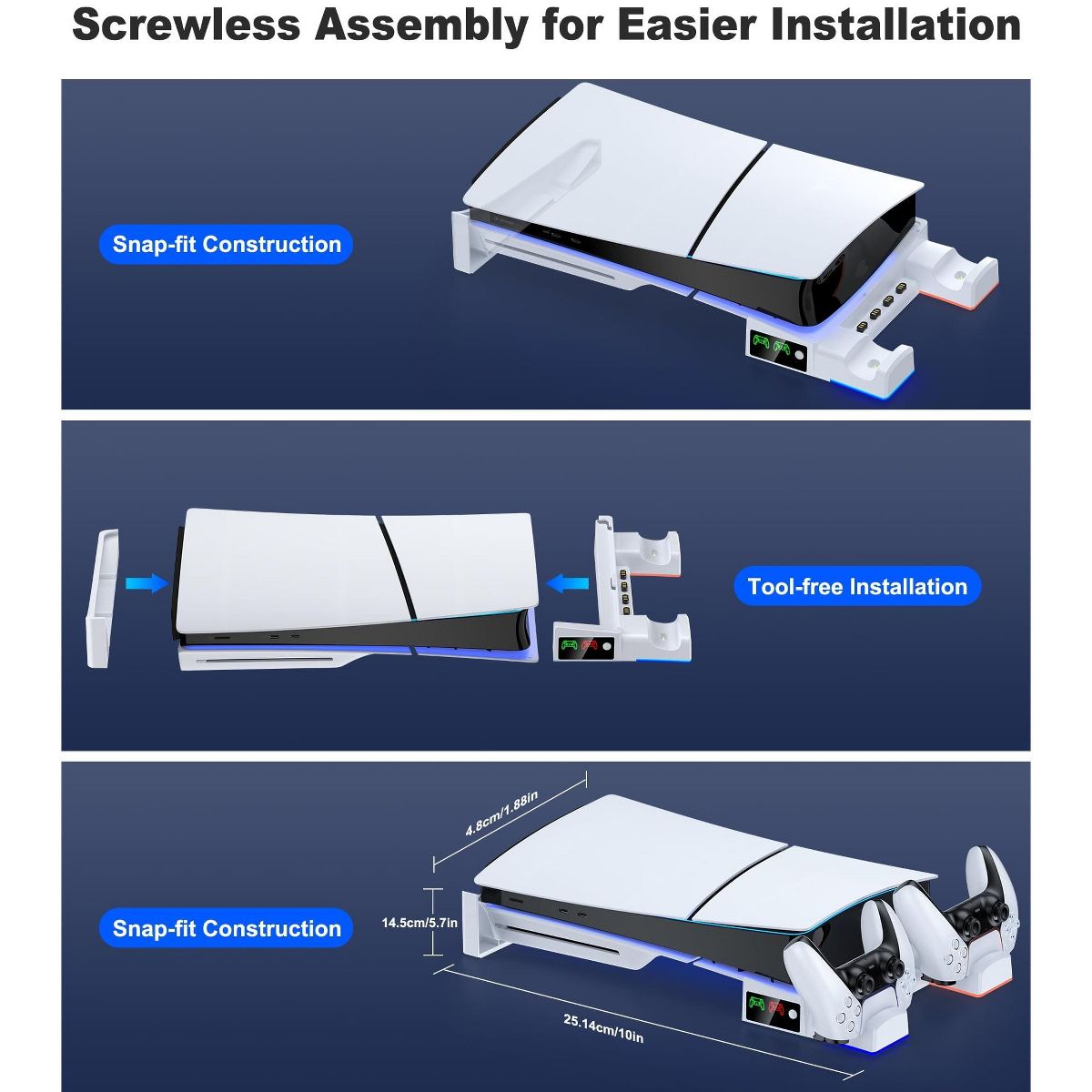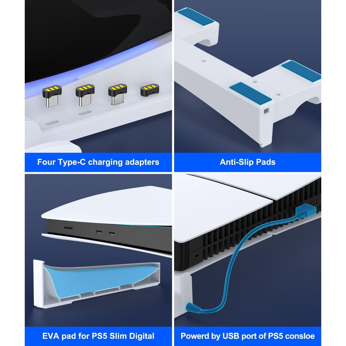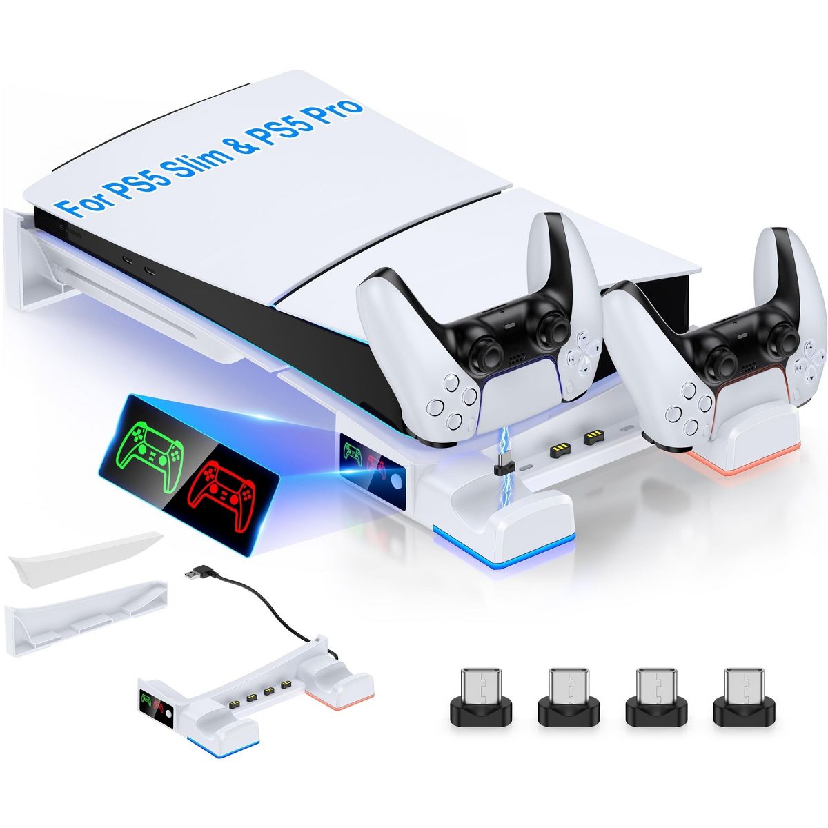 Beboncool PS5 Slim Horizontal Stand PS5 Pro Stand with Dual PS5 Controller Charger with LED White