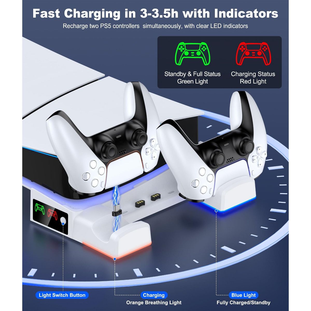 Exclusive Design, Perfect Fit: Tailored for the 2023 PlayStation 5 Slim/PS5 PRO gaming console. it offers Fast Charging, Always Ready as it can fully charge 2 PS5 controllers in 3 hours and the side screen shows charging status.