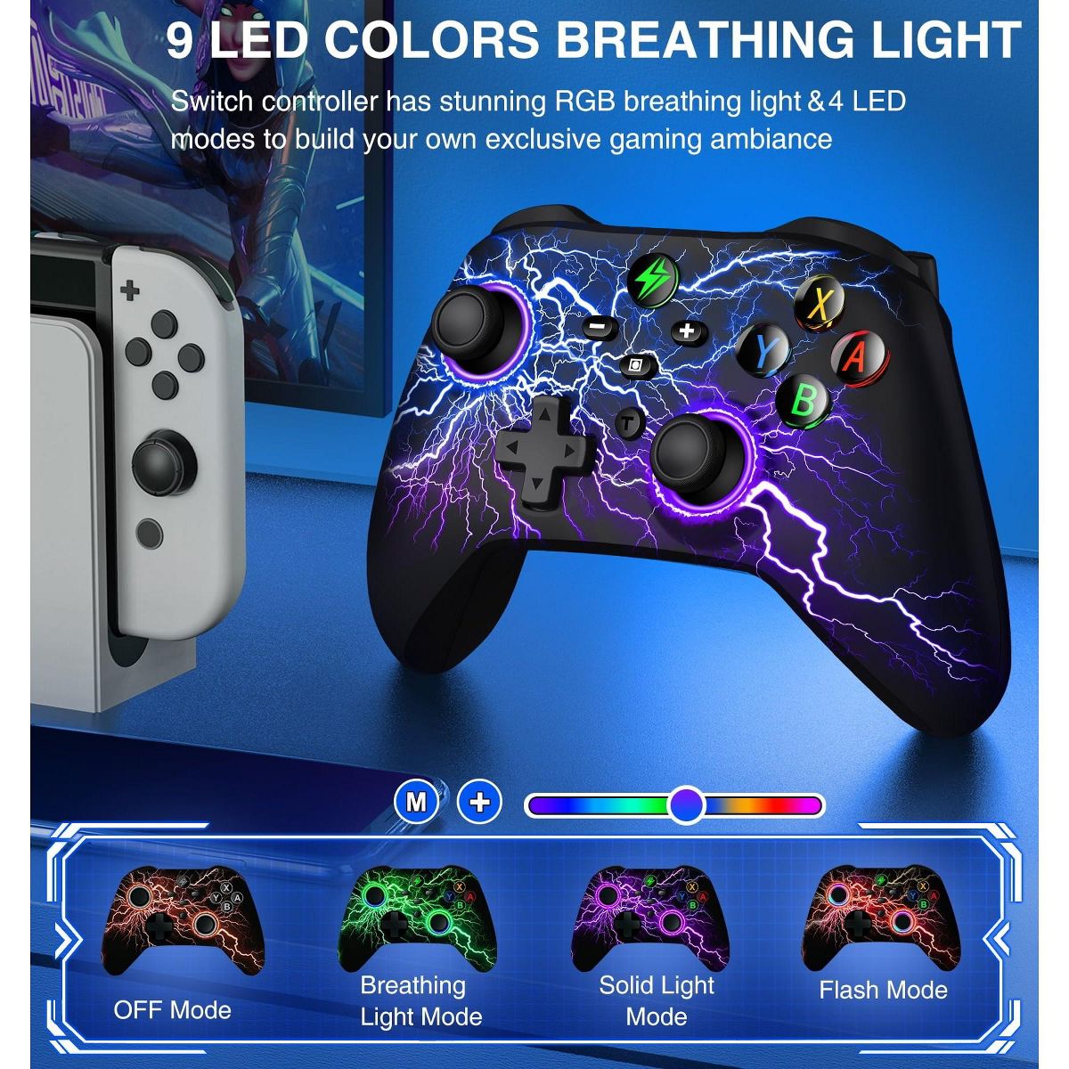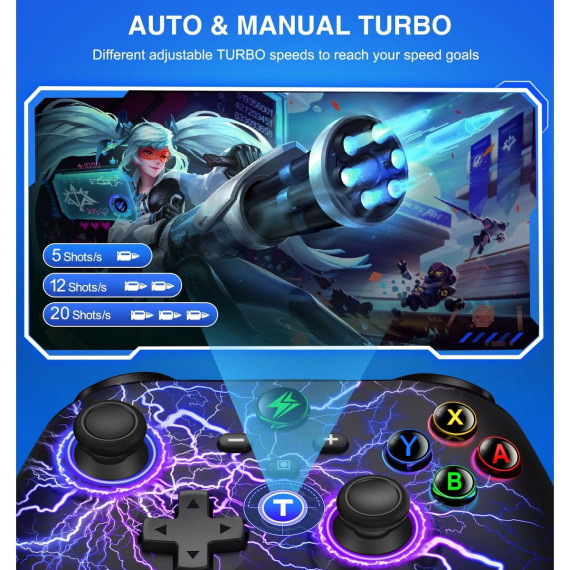 lighting modes with 9 selectable colors, it enables dynamic ambiance customization aligned with gameplay scenarios. Advanced haptic immersion is achieved through dual vibration motors and 6-axis gyroscopic motion control, enhanced by 4-level adjustable feedback intensity. Competitive gamers benefit from programmable rear buttons and turbo configuration capabilities, while the ergonomic design ensures extended comfort during marathon sessions.