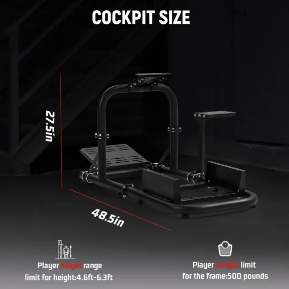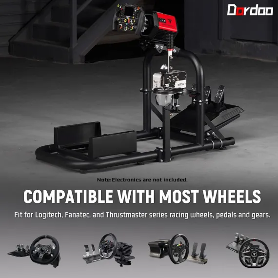 Dardoo the cockpit stand allows for a personalized driving experience with its two-stage adjustable steering wheel platform and customizable pedal angles. It is important to note that the Dardoo cockpit is a dedicated frame; the actual steering wheel, pedals, gear shifter, and seat are not included, allowing you the freedom to complete your perfect sim racing rig.