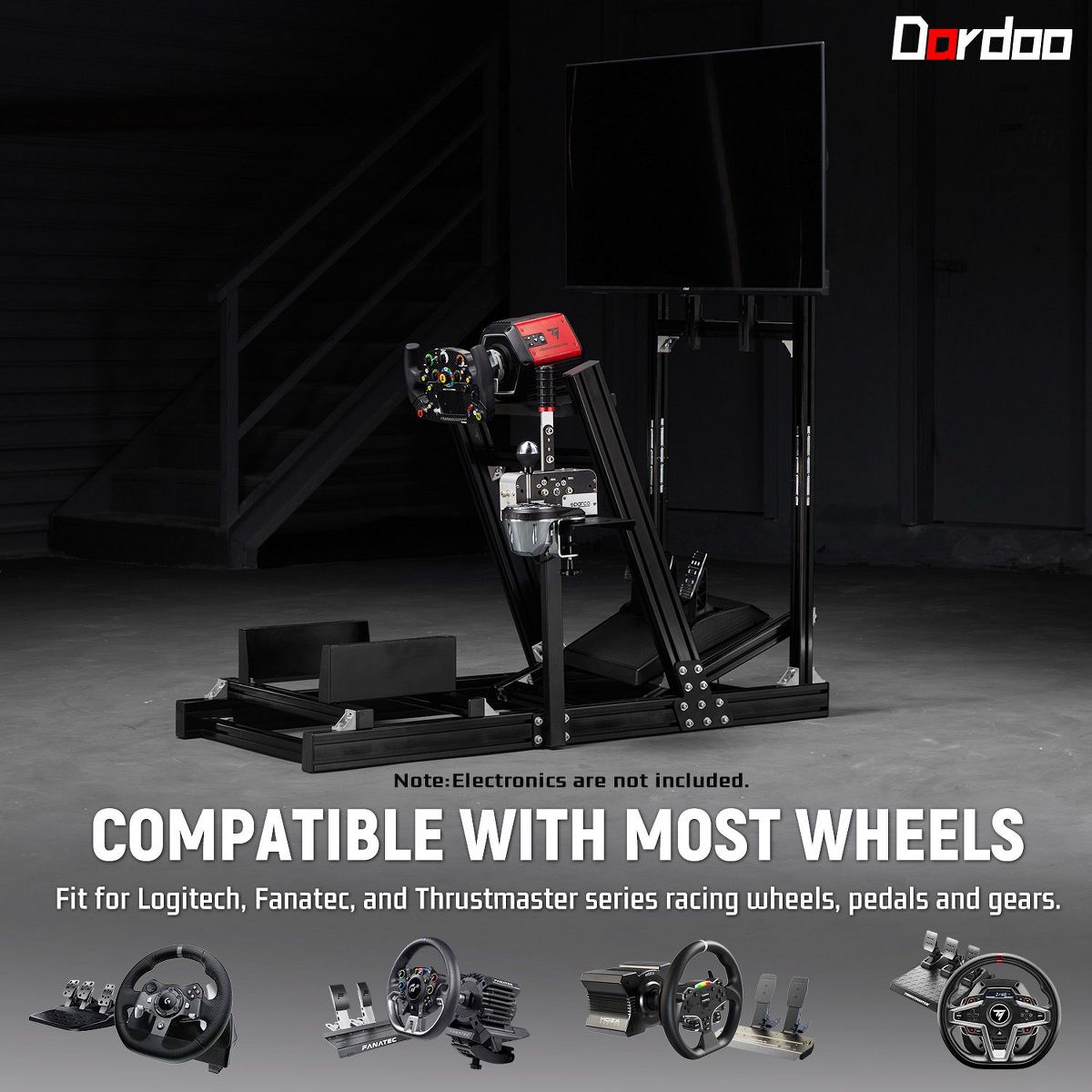 Dardoo aluminum racing sim cockpit ensures broad compatibility with leading peripheral brands and maintains a modular, upgrade-ready design. Please note that essential components such as the steering wheel, pedals, handbrake, and monitors are not included, allowing for complete personalization.