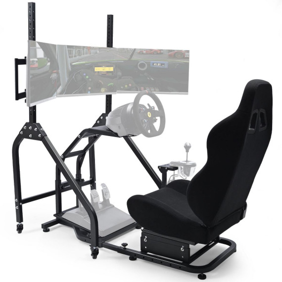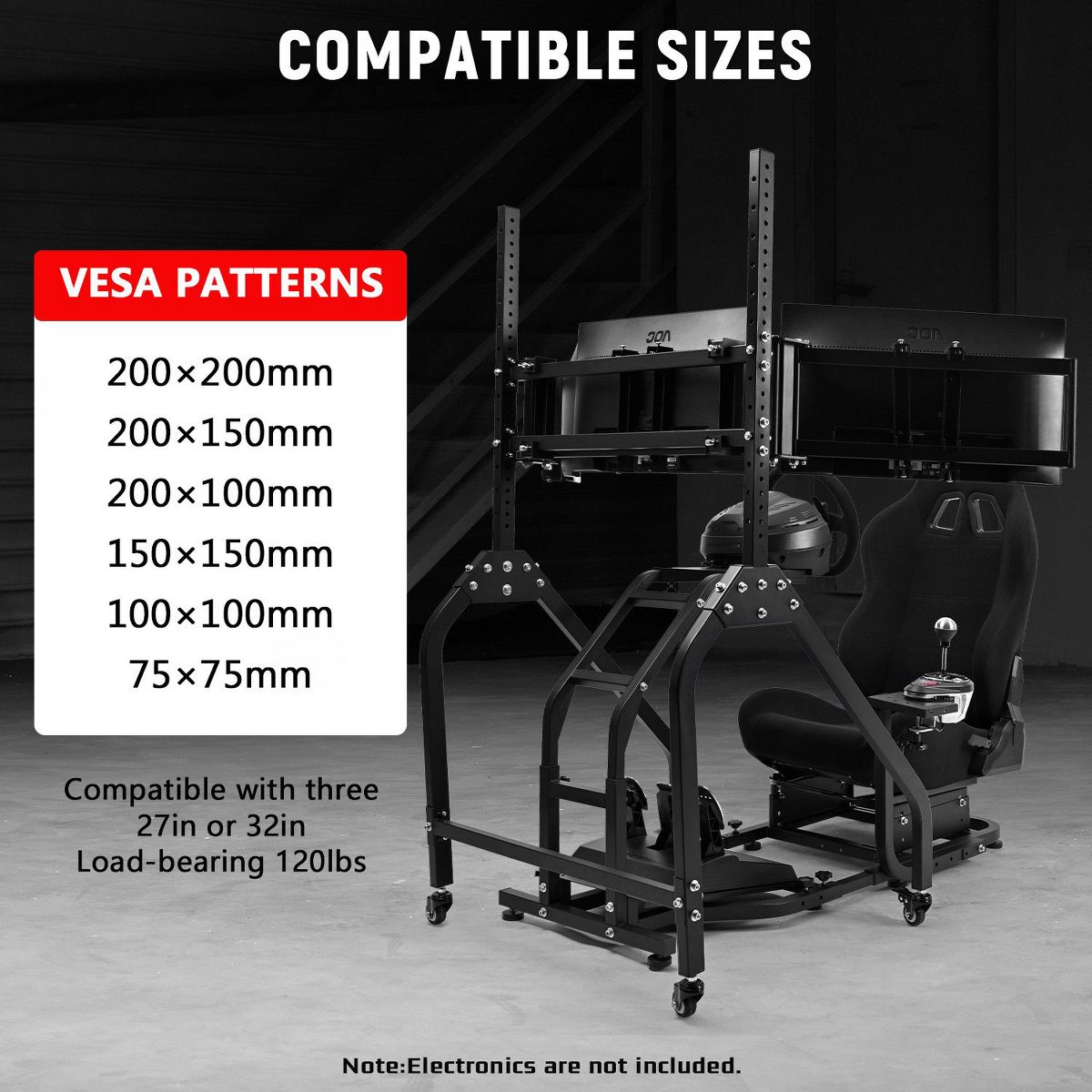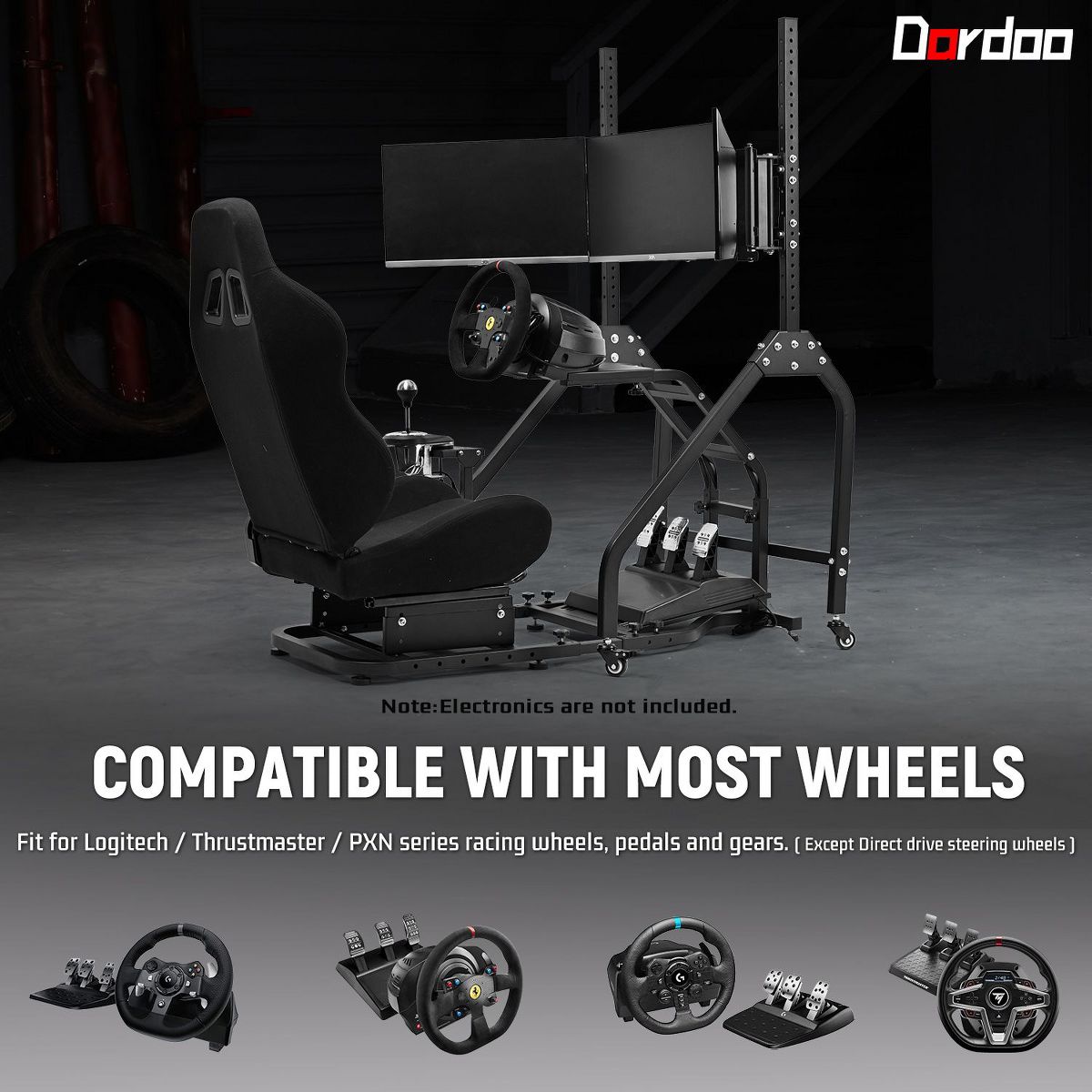 Dardoo completes your simulation ecosystem with a sturdy triple monitor stand compatible with 27or32 inch displays, featuring lockable wheels and reinforced bolts to eliminate wobbling. Offering universal compatibility with major gaming brands and quick assembly for VR or triple-screen setups, Dardoo delivers a professional-grade racing experience suitable for both training and casual gaming. Please note, all electronic peripherals and monitors are sold separately.