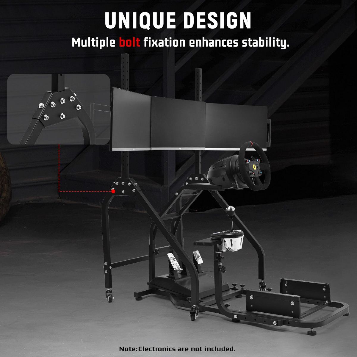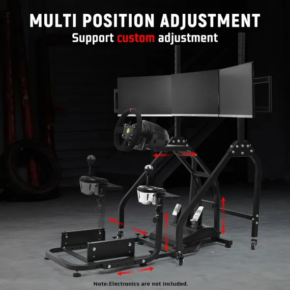 Dardoo the triple monitor mount included in this product holds three screens securely while allowing easy room rearrangement. The stand rolls on locking wheels and adjusts for perfect viewing height. Please note this product includes only the frame and triple monitor stand - steering wheels, pedals and other electronics must be bought separately to complete your racing setup.