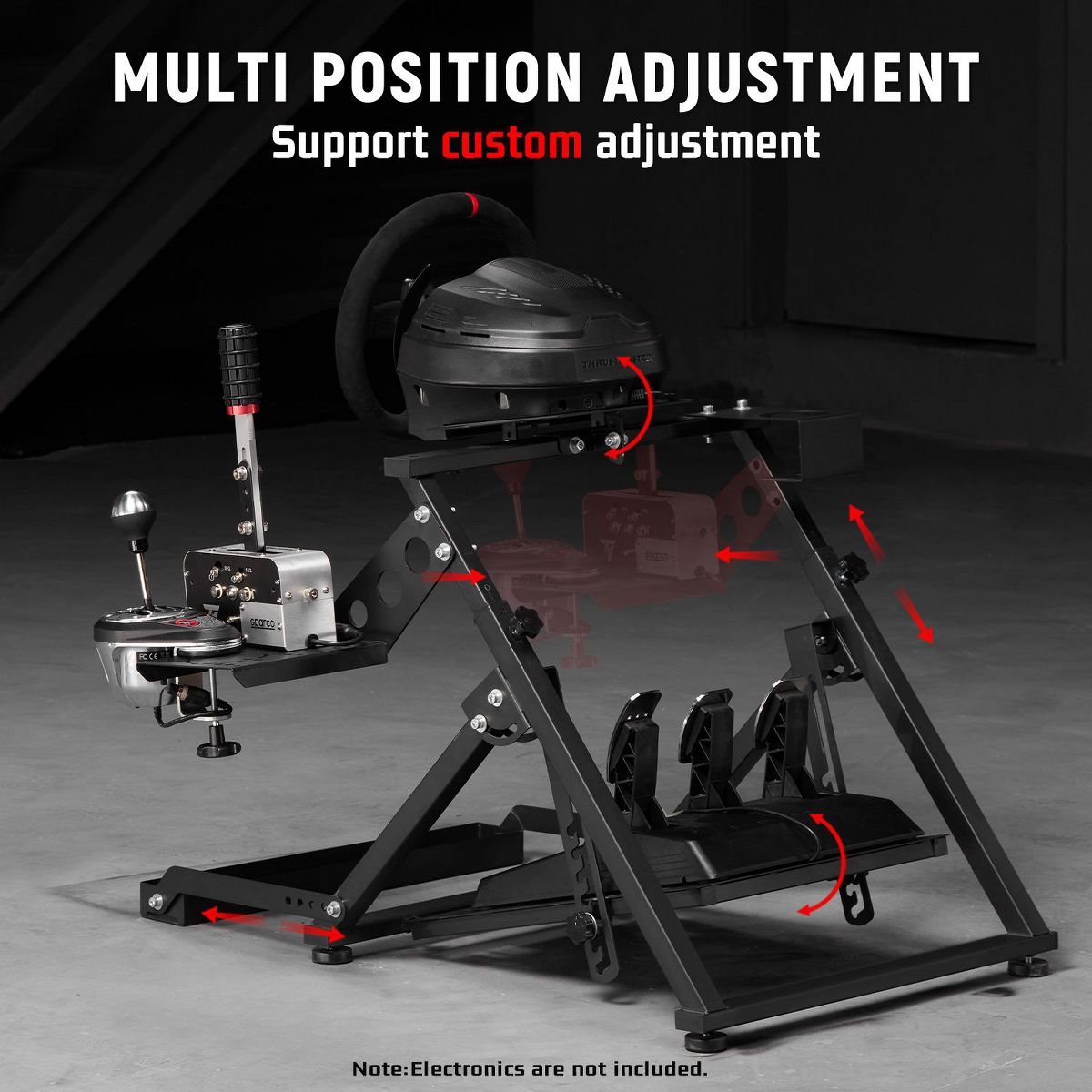 Dardoo racing wheel stand provides a highly customizable experience, allowing you to adjust the wheel height, pedal angle, and steering wheel position, while also offering interchangeable left/right mounting for the gear shifter and cup holder. Please be aware that the Dardoo stand is sold as a chassis only; all gaming peripherals such as the steering wheel, pedals, and shifter are not included.