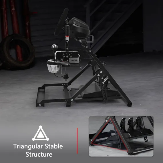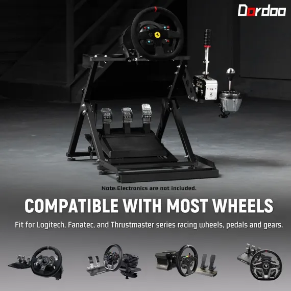 Dardoo simulator wheel stand features a unique double-triangle structure and non-slip feet for superior stability, preventing seat slippage during sudden stops. They offer extensive compatibility with brands like Logitech, Thrustmaster, and Fanatec, and are designed for incredible convenience—arriving 80% pre-assembled for a 10-minute setup and folding down in just seconds to save storage space.