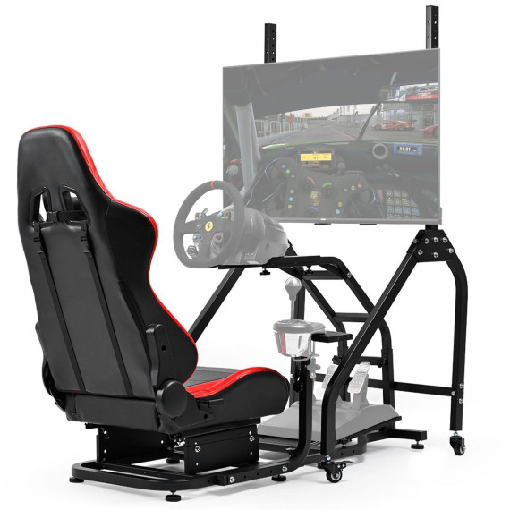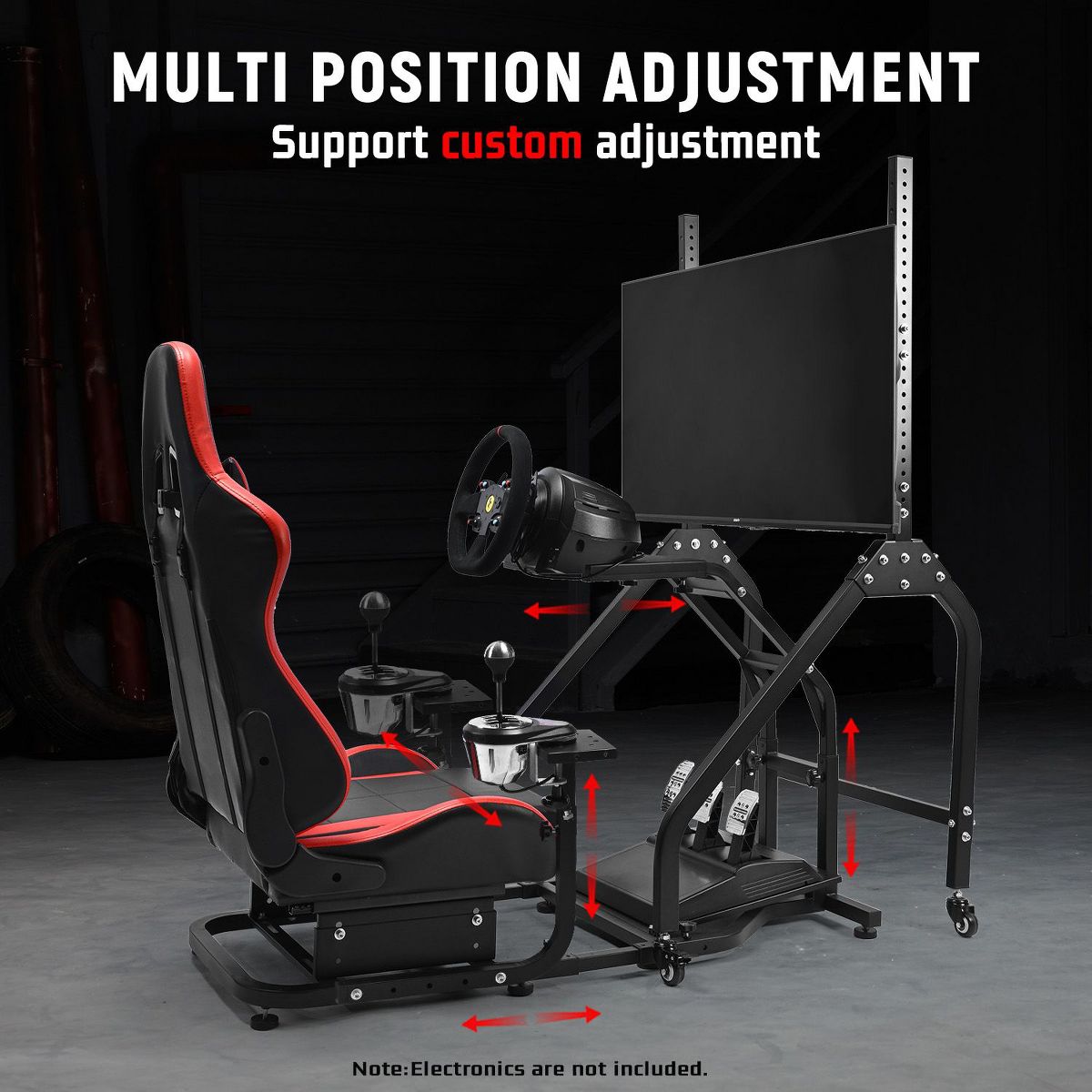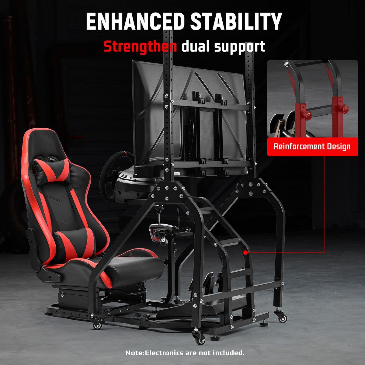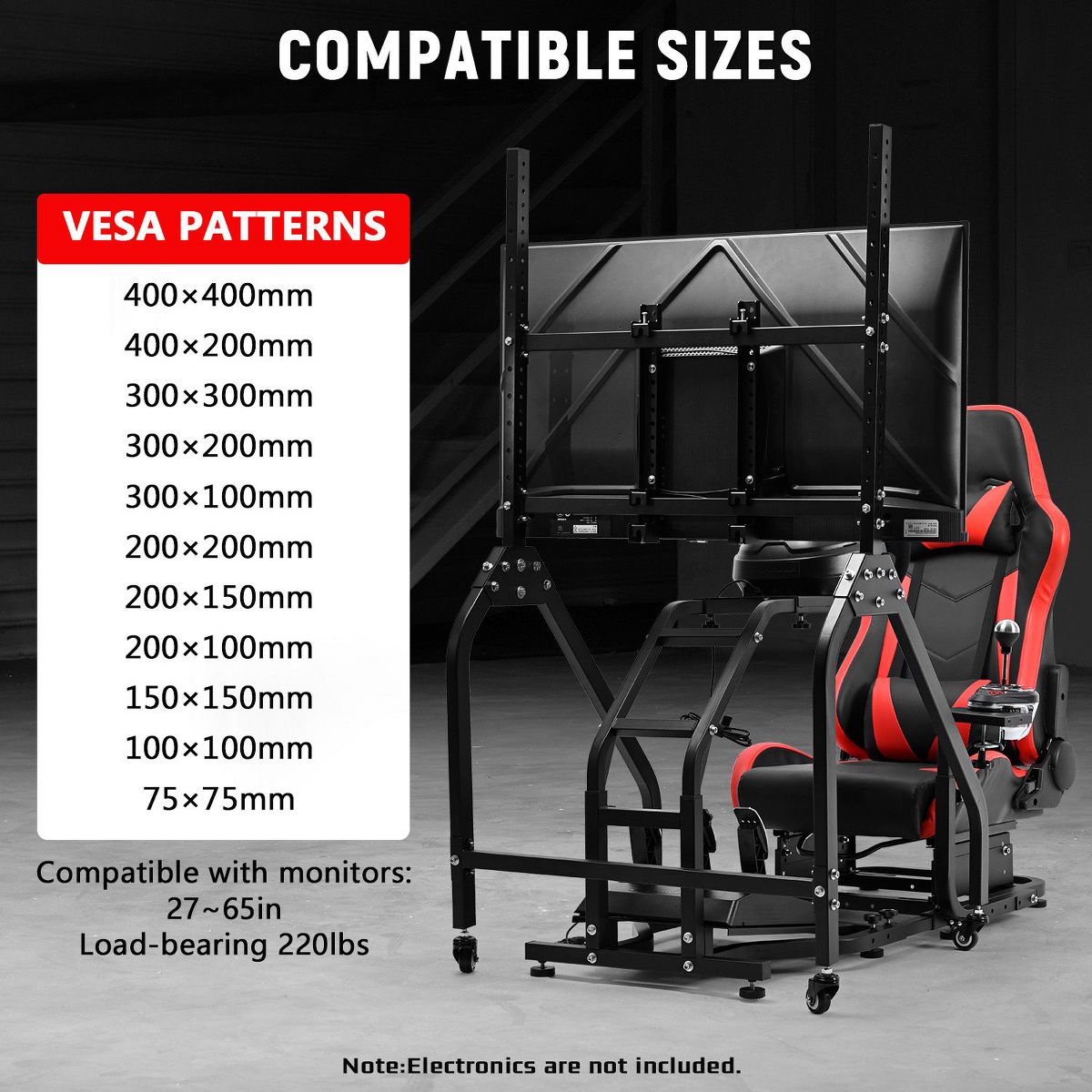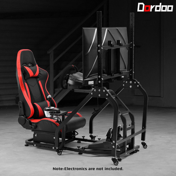 Dardoo ecosystem is completed by a stable yet mobile monitor stand with locking wheels and a heavy-duty cockpit construction that supports up to 300lbs. With non-slip rubber feet for firm stability on any floor and wide compatibility with major accessory brands, Dardoo creates an incredibly immersive and flexible platform for all sim racers and flight enthusiasts. Please note, all electronic peripherals and monitors are not included.