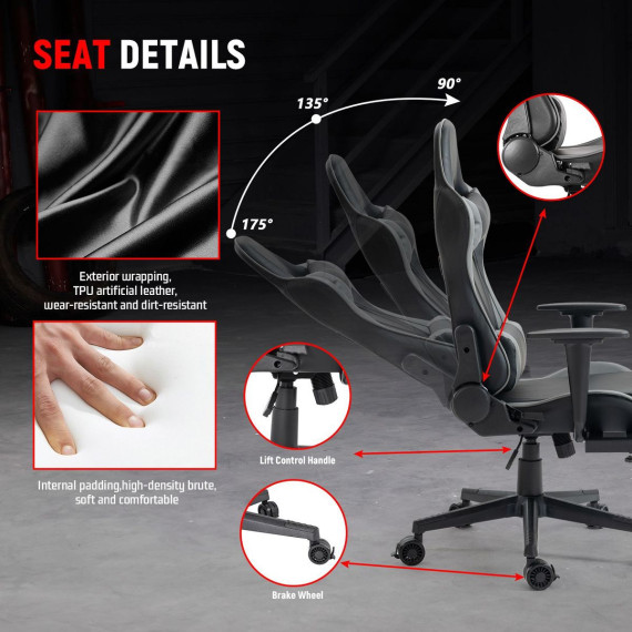Dardoo gaming chair is engineered for enduring comfort during long sessions. It comes standard with memory foam head and lumbar pillows for optimal support, helping to reduce fatigue. The chair offers practical adjustability with seat height control and a reclining backrest that tilts from 90° to 180°. For easy mobility and stability, it features smooth-rolling casters that can be securely locked in place when needed.