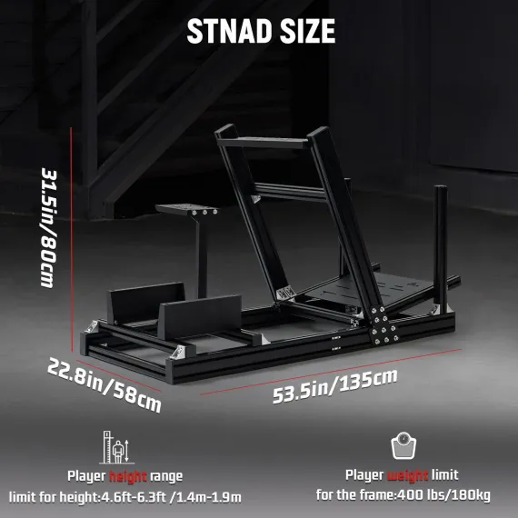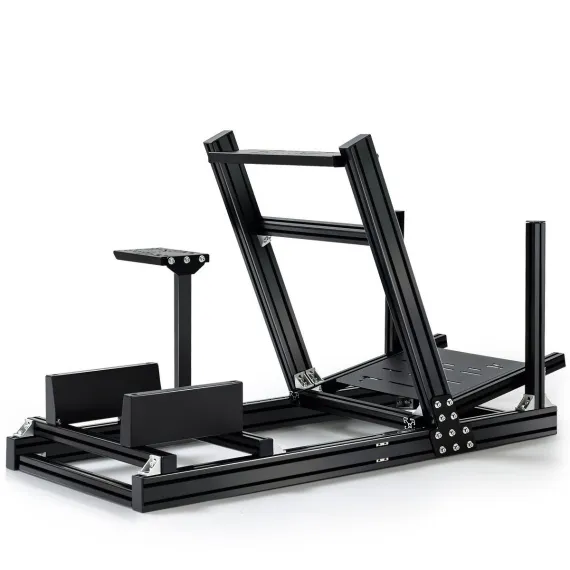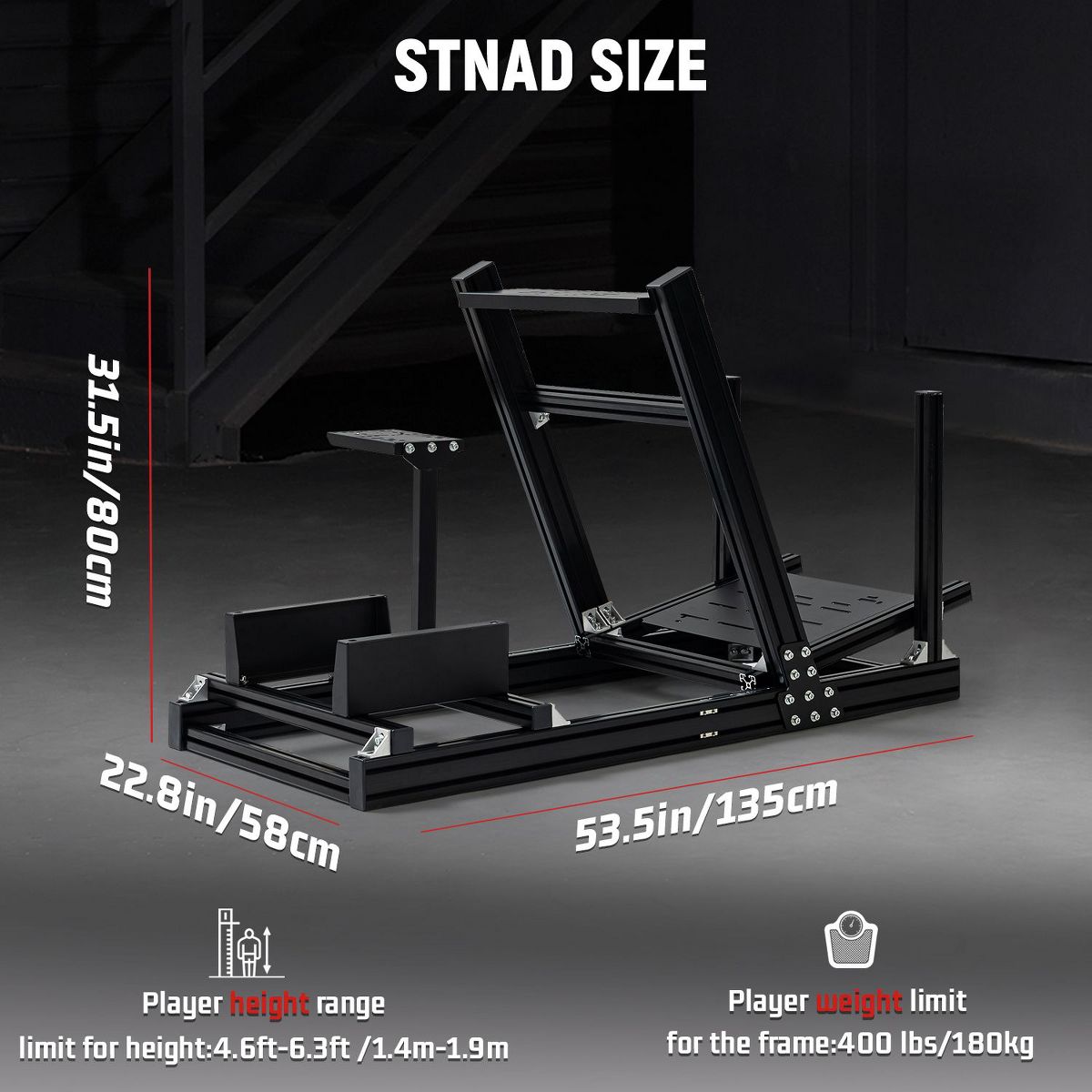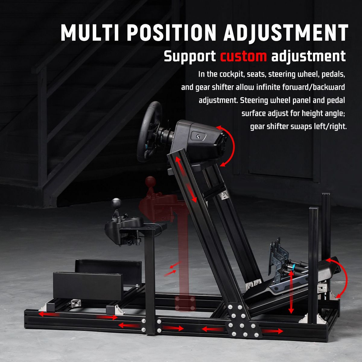 Dardoo aluminum racing wheel stand features a professional design using European-standard 4040/4080 aluminum profiles for superior scalability and strength, with fully adjustable components employing 4-hole slotted connectors for stepless adjustment of the wheel, pedals, and shift lever platform that can simultaneously hold a handbrake and shifter. The cockpit delivers a simulated racing experience by allowing F1 positioning through seat plate removal and truck racing posture by adjusting pedals to 0°.