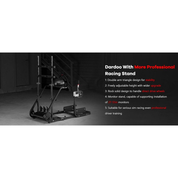 Dardoo steering wheel stand features an upgraded dual-column structure with integrated mounting points for a monitor bracket, offering enhanced stability for an immersive DIY setup. It is highly adaptable, compatible with over 90% of market gaming chairs and robust enough for direct-drive wheels, while also offering extensive customization for steering wheel, shifter, pedal, and seat positioning.