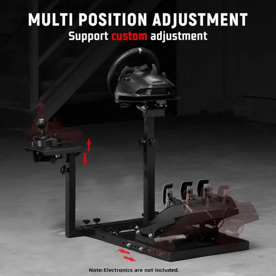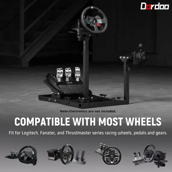 Dardoo the wheel stand offers innovative versatility with an enlarged shifter platform that can accommodate both a gear lever and a handbrake for professional racing operations. The stand is universally compatible with most major brands like Logitech and Thrustmaster. Please be aware that the Dardoo stand is sold as a chassis only; the steering wheel, pedals, and shift lever are not included.