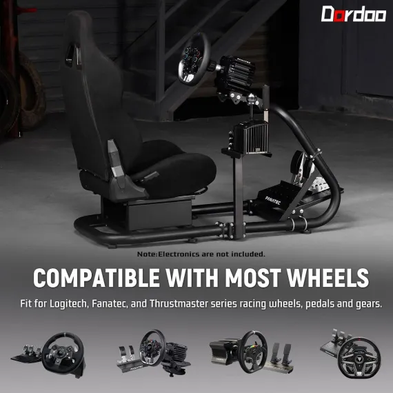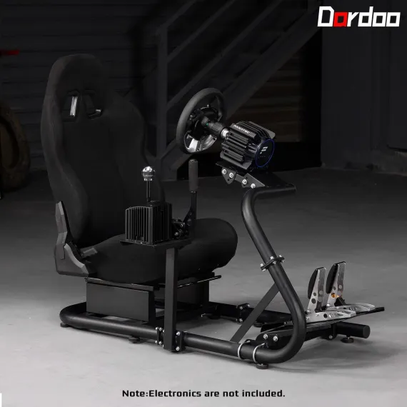 Dardoo racing simulatior cockpit is made of high-strength alloy steel material, with a surface treated with black metal powder coating, which has excellent wear resistance and rust prevention performance; Equipped with a multi angle adjustable two-stage steering wheel platform, customizable pedal and shift lever angles, suitable for mainstream devices such as Logitech, Fanatec, Thrustmaster, etc., compatible with direct drive steering wheel installation, meeting diverse driving needs.