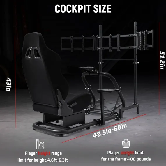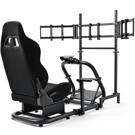Dardoo Racing Simulator Cockpit with Triple Monitor Stand & Black Seat Fits Logitech, Thrustmaster & Fanatec No Wheel, Pedals or Handbrake