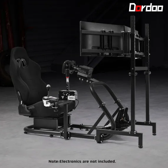 Dardoo complete cockpit enhances user comfort with a multi-position ergonomic seat featuring dual sliding rails and high-resilience padding, accommodating individuals from 1.5m to 1.9m tall. As a complete structural solution, the Dardoo cockpit requires separate purchase of electronic peripherals, providing a robust and customizable foundation for serious sim racing enthusiasts.