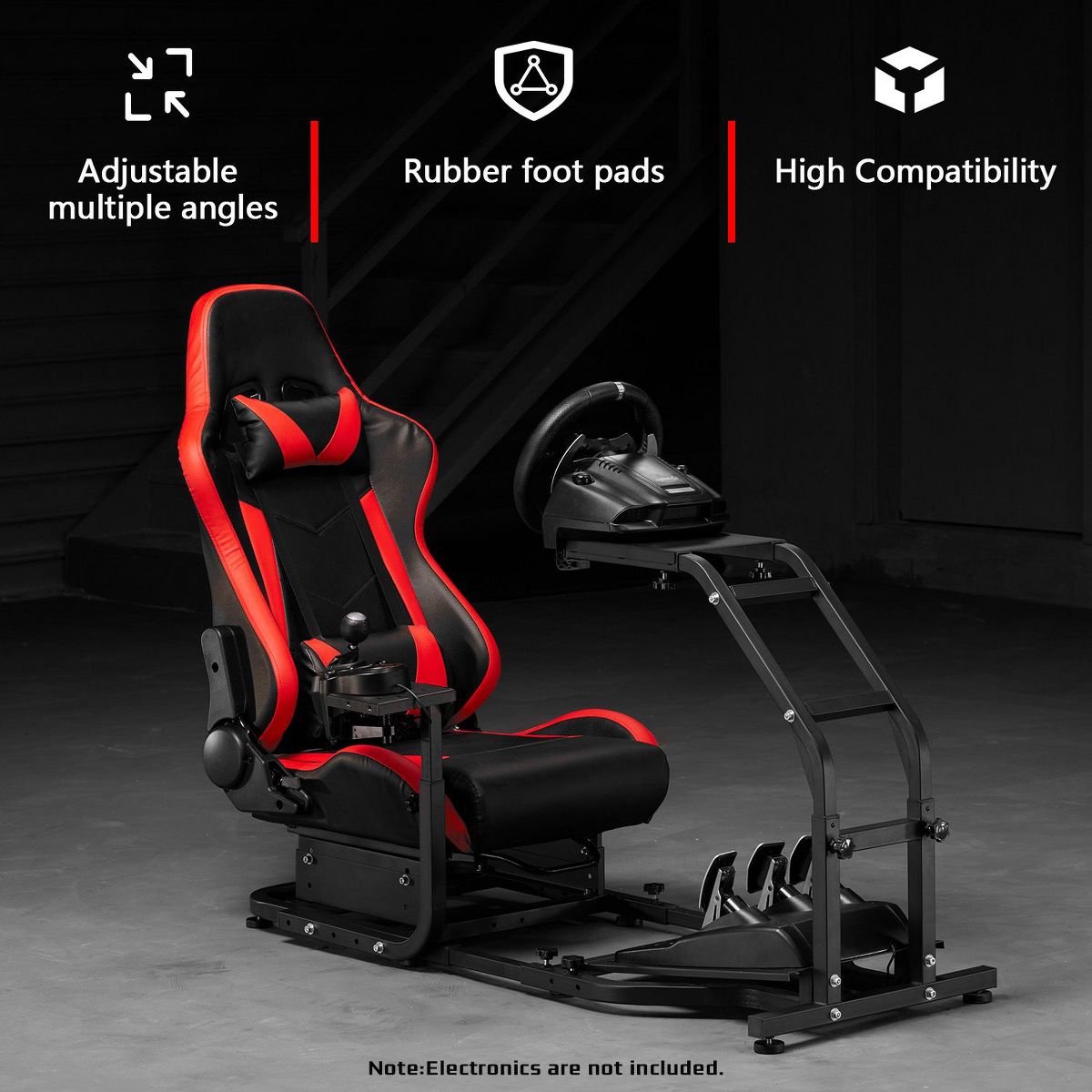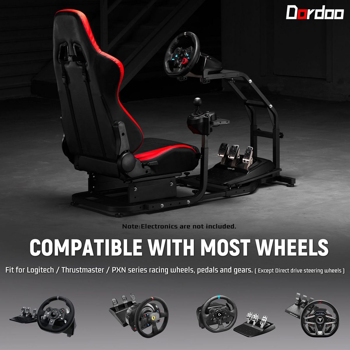 Dardoo ensures broad compatibility with major brands like Logitech, Fanatec, and Thrustmaster, accommodating models such as the G920 and T300RS. Its robust construction, complemented by floor-gripping rubber feet, guarantees a solid and shake-free experience during the most intense simulations. Please note that the steering wheel, pedals, and shifter are not included with the Dardoo cockpit.