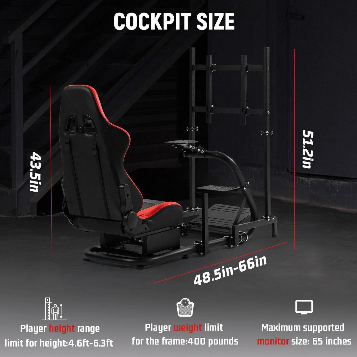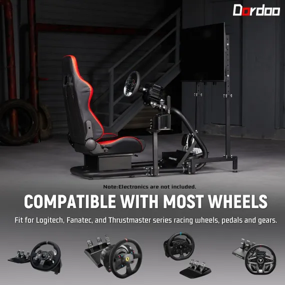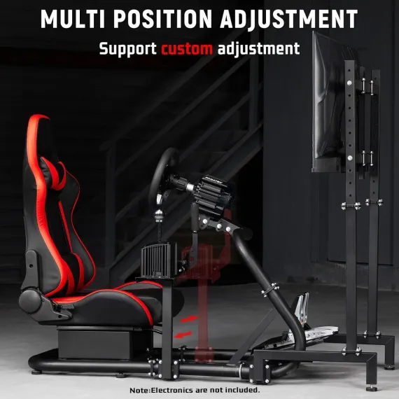 Dardoo racing simulatior cockpit, red leather seats, adjustable design, seat backrest can be adjusted 90 ° -180 °. The monitor bracket supports installation sizes ranging from 75 * 75 to 400 * 400, and can accommodate multiple specifications of monitor installation sizes.
