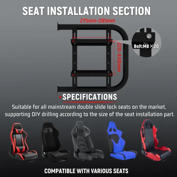 Dardoo racing cockpit begins with industrial-grade construction featuring 50mm steel tubing and reinforced flange connections that deliver uncompromising stability. The precision customization system offers extensive adjustment ranges from 2.5° to 32.5° for pedals and 0° to 40° for steering platforms, while enhanced U-clamp fastening and anti-collision design ensure maximum structural integrity during intense racing sessions.