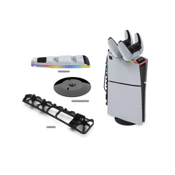 The DOBE 3-in-1 PS5 Slim Kit is a multifunctional accessory designed specifically for the PS5 Slim console. It features a stylish stand that provides stability, supports dual controller charging for convenience, and includes built-in colorful ambient lighting to enhance your gaming setup. The TP5-35130 model combines function and aesthetics, making it an ideal all-in-one solution for PS5 Slim users.