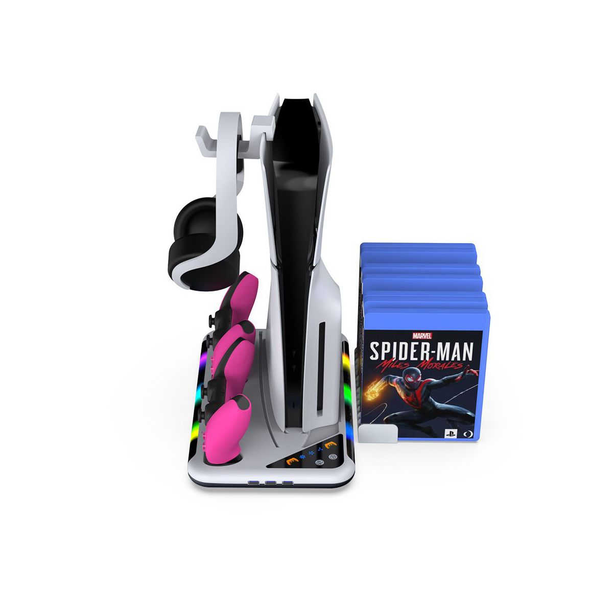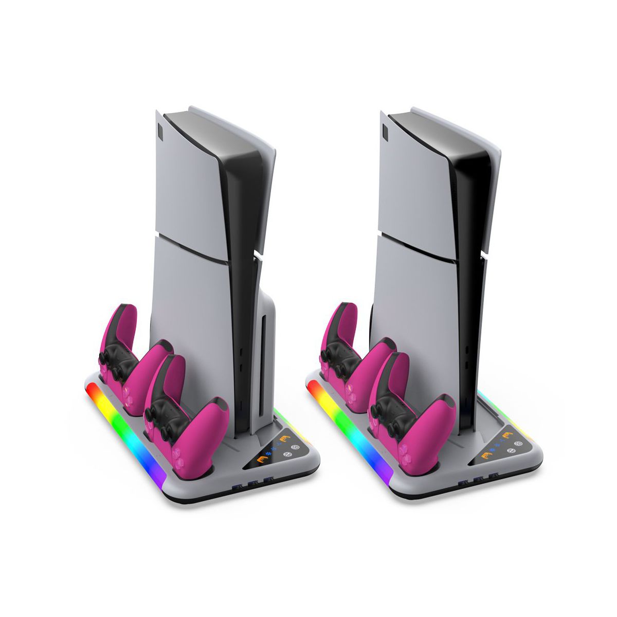 The DOBE TP5-3557 is a multifunctional RGB cooling stand designed for both PS5 and PS5 Slim consoles, combining style and practicality. It features built-in cooling fans to help prevent overheating during extended gameplay and includes two charging docks for DualSense controllers, keeping them powered and organized. The integrated RGB lighting adds a modern, immersive touch to any gaming setup.
