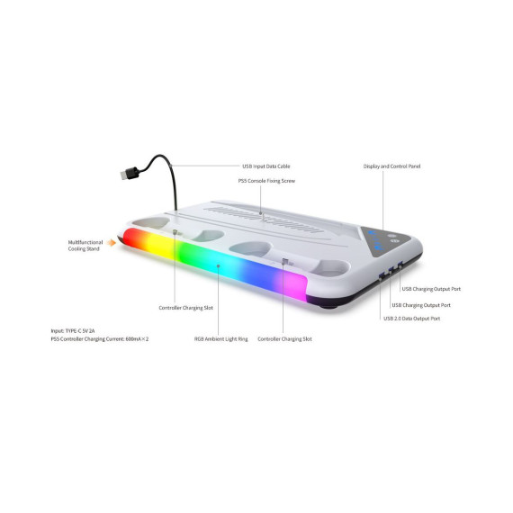 - Dual-Grip Charging: Supports simultaneous charging of two PS5 controllers, with charging status indicated by different color indicator lights. RGB Ambient Light: The base is equipped with RGB super cool and colorful ambient light ring, with a total of ten lighting modes to choose from, enhancing the visual effect of the gaming experience.