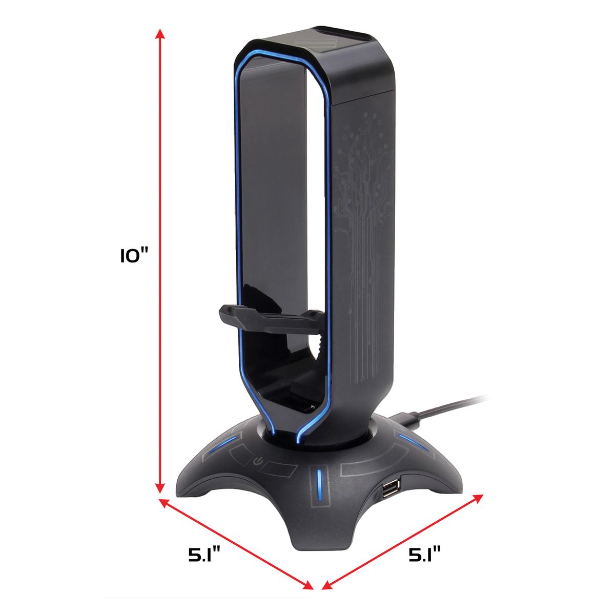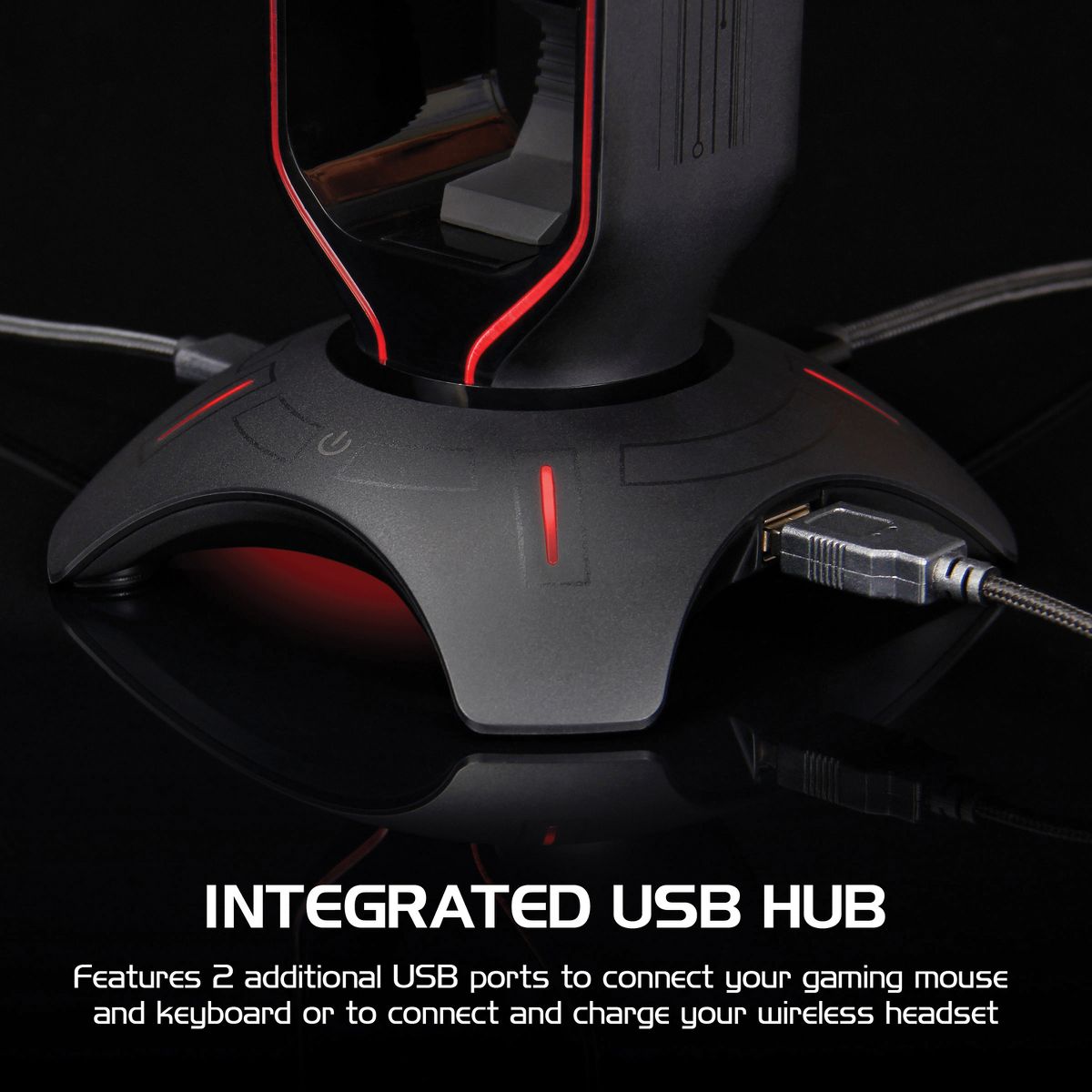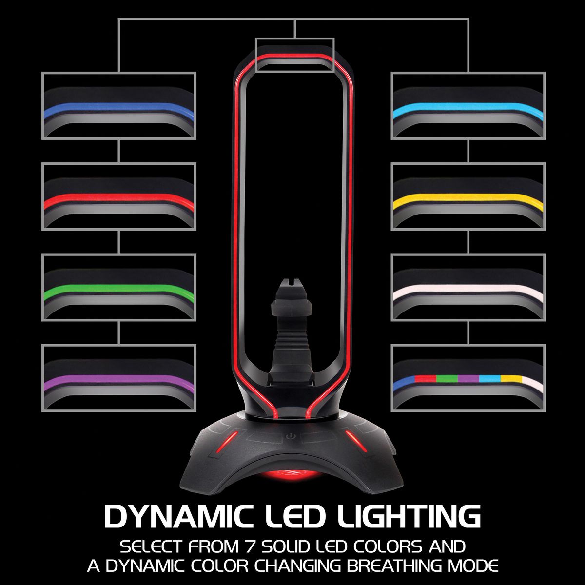 Embellish your desktop with the ENHANCE Headset Stand with Built-in Mouse Bungee and USB Hub. The 3-in-1 design saves tons of desktop space and serves multiple functions in 1 convenient and elegant-looking desktop accessory. The headset stand organizes and displays your favorite gaming headset and features 2 extra USB ports to charge wireless gaming headsets. Sleek-looking LED accents rise up and underline your headset in 7 different colors._