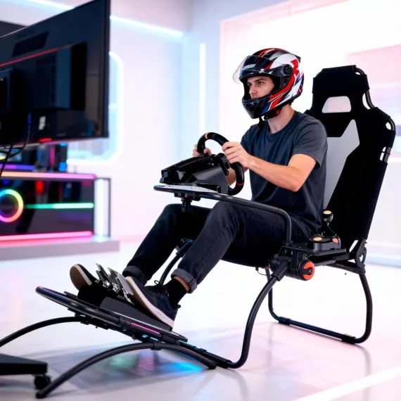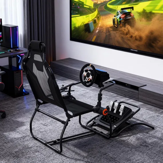 This racing stand provides a firm base for immersive play. Its reinforced steel frame remains secure during use. It fits a range of popular racing peripherals via adaptable mounting points. The design focuses on personal comfort, featuring an adjustable wheel mount, a multi-use shifter holder, and variable pedal positioning. The unit is upholstered for comfort during long sessions and folds away neatly, making it a practical choice for spaces of any size. Professional installation is recommended for optimal assembly.