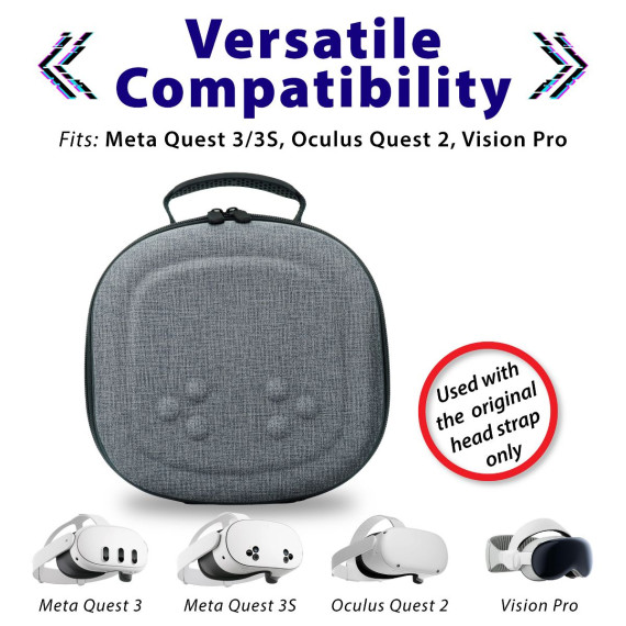 Fosmon’s hard carrying case is compatible with Meta Quest 3/3S, Oculus Quest 2, and Vision Pro. it is NOT compatible with any Elite straps or other third party straps.