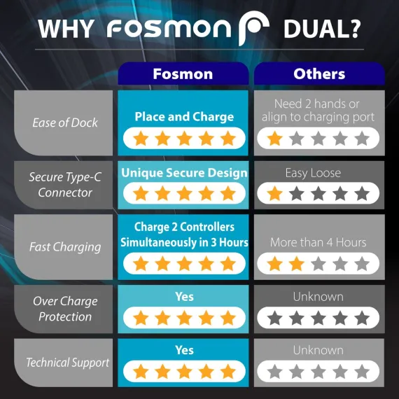 Fosmon’s DUAL charging station allows up to two controllers to charge at the same time for maximum efficiency and use. Charge your controllers where you want and how you want. Be in control of your battery life at all times.